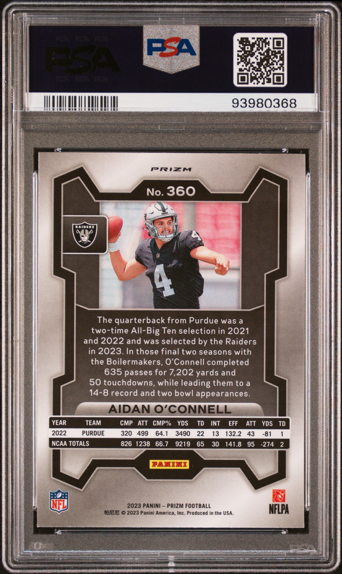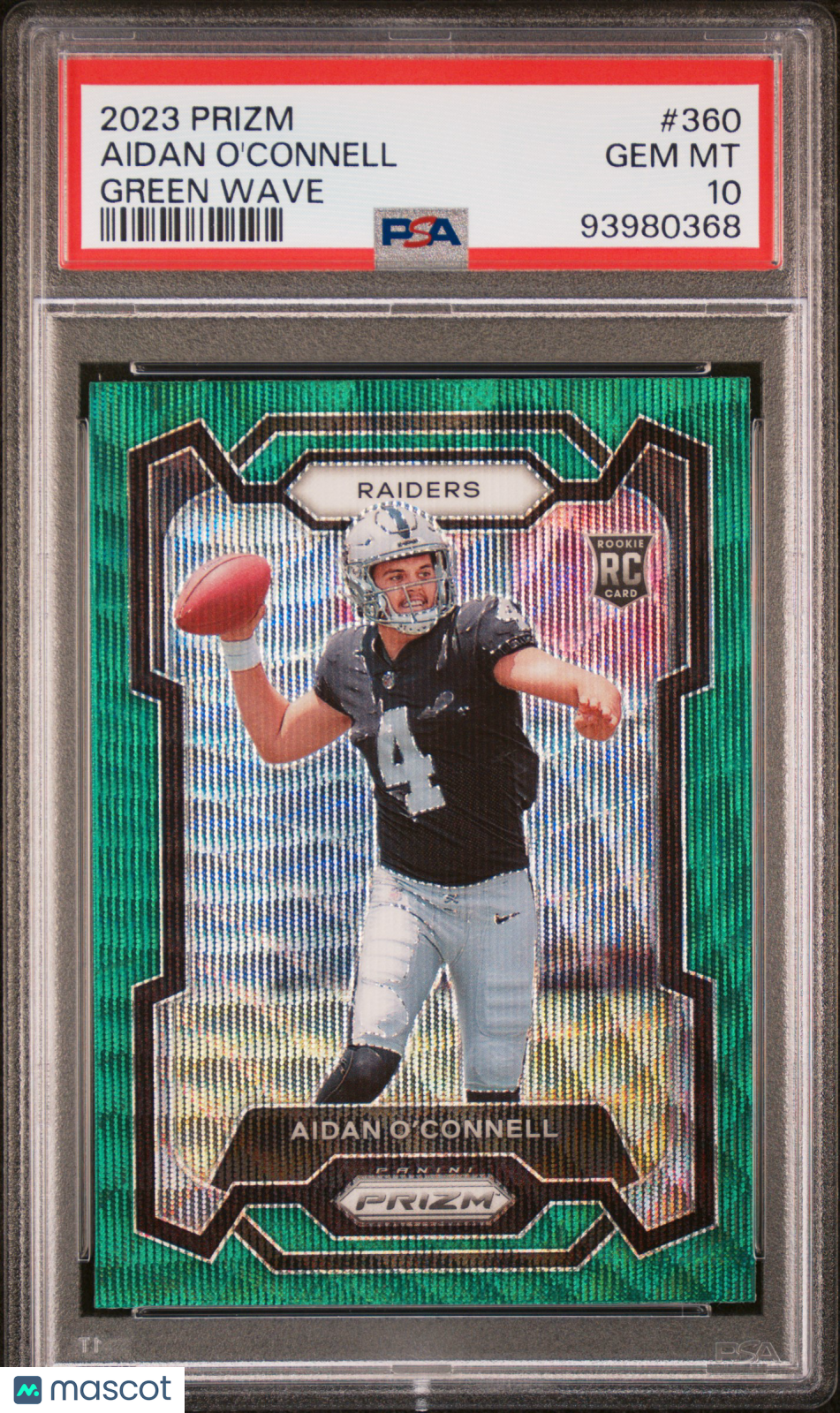 You are purchasing a Aidan O'Connell 2023 Panini Prizm #360 Green Wave RC PSA10 GEM MT. You will receive the exact card shown in the photos. CONDITION GUARANTEE We provide detailed, high-resolution photos of every card. What you see is exactly what you'll receive. COMPETITIVE PRICING NOTICE Our cards are priced competitively based on current market data and recent sales. We regularly review and adjust our pricing to ensure fair market value for both buyers and collectors. PAYMENT POLICY ATX Cards requires all payments within four (4) days of purchase. Failure to make payment will result in cancellation of the order. SHIPPING All items are packaged with professional protective materials using USPS First Class or Priority. FREE COMBINED SHIPPING on multiple purchases. ABOUT US ATX Cards & Collectibles is your trusted Austin, Texas source for sports cards and collectibles. You can find us on our website, eBay, COMC, MyCardPost, Instagram, WhatNot, and at card shows nationwide. Whether you're buying, selling, or trading, we're here to help you build your collection. Listed With Mascot.