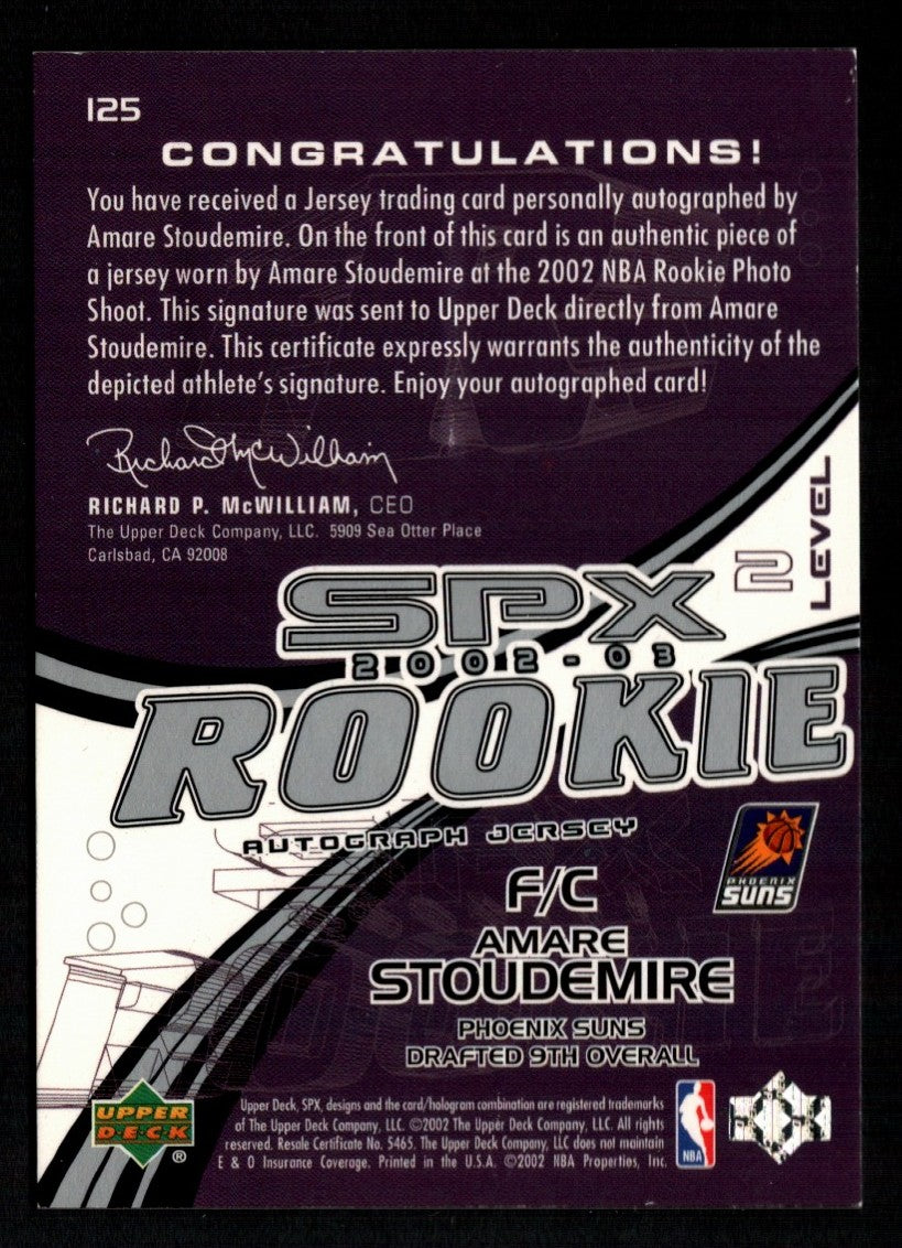 You are purchasing a Amar'e Stoudemire 2002-03 Upper Deck SPx #125 Rookie Level 2 Patch /1999 RC Auto . You will receive the exact card shown in the photos. There is minor whiting around the edges and corners. CONDITION GUARANTEE We provide detailed, high-resolution photos of every card. What you see is exactly what you'll receive. COMPETITIVE PRICING NOTICE Our cards are priced competitively based on current market data and recent sales. We regularly review and adjust our pricing to ensure fair market value for both buyers and collectors. PAYMENT POLICY ATX Cards requires all payments within four (4) days of purchase. Failure to make payment will result in cancellation of the order. SHIPPING All items are packaged with professional protective materials using USPS First Class or Priority. FREE COMBINED SHIPPING on multiple purchases. ABOUT US ATX Cards & Collectibles is your trusted Austin, Texas source for sports cards and collectibles. You can find us on our website, eBay, COMC, MyCardPost, Instagram, WhatNot, and at card shows nationwide. Whether you're buying, selling, or trading, we're here to help you build your collection. Listed With Mascot.