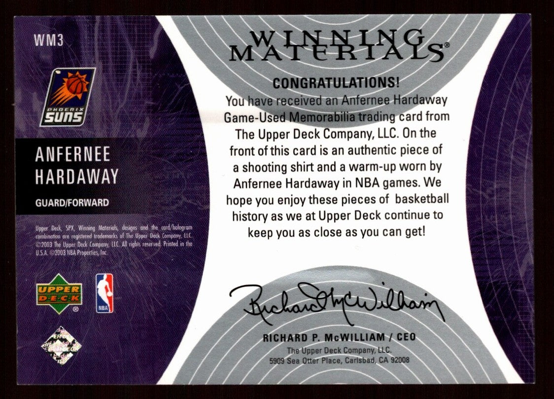 You are purchasing a Anfernee Hardaway 2003 Upper Deck SPx #WM3 Winning Materials Dual Patch Suns. You will receive the exact card shown in the photos. CONDITION GUARANTEE We provide detailed, high-resolution photos of every card. What you see is exactly what you'll receive. COMPETITIVE PRICING NOTICE Our cards are priced competitively based on current market data and recent sales. We regularly review and adjust our pricing to ensure fair market value for both buyers and collectors. PAYMENT POLICY ATX Cards requires all payments within four (4) days of purchase. Failure to make payment will result in cancellation of the order. SHIPPING All items are packaged with professional protective materials using USPS First Class or Priority. FREE COMBINED SHIPPING on multiple purchases. ABOUT US ATX Cards & Collectibles is your trusted Austin, Texas source for sports cards and collectibles. You can find us on our website, eBay, COMC, MyCardPost, Instagram, WhatNot, and at card shows nationwide. Whether you're buying, selling, or trading, we're here to help you build your collection. Listed With Mascot.