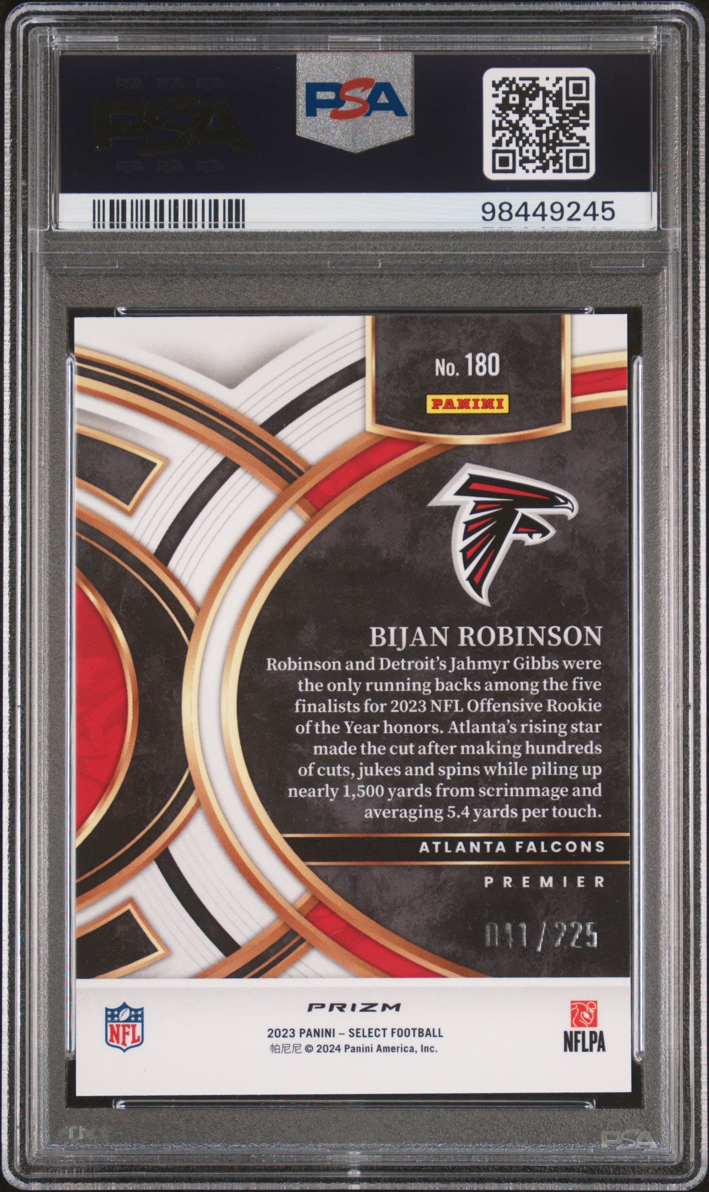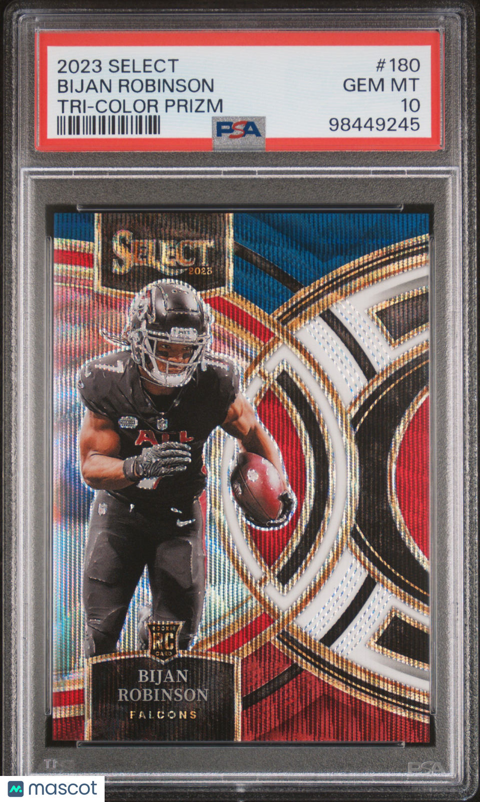 You are purchasing a Bijan Robinson 2023 Panini Select #180 Tri Color Prizm /225 RC PSA10 GEM MT. You will receive the exact card shown in the photos. CONDITION GUARANTEE We provide detailed, high-resolution photos of every card. What you see is exactly what you'll receive. COMPETITIVE PRICING NOTICE Our cards are priced competitively based on current market data and recent sales. We regularly review and adjust our pricing to ensure fair market value for both buyers and collectors. PAYMENT POLICY ATX Cards requires all payments within four (4) days of purchase. Failure to make payment will result in cancellation of the order. SHIPPING All items are packaged with professional protective materials using USPS First Class or Priority. FREE COMBINED SHIPPING on multiple purchases. ABOUT US ATX Cards & Collectibles is your trusted Austin, Texas source for sports cards and collectibles. You can find us on our website, eBay, COMC, MyCardPost, Instagram, WhatNot, and at card shows nationwide. Whether you're buying, selling, or trading, we're here to help you build your collection. Listed With Mascot.