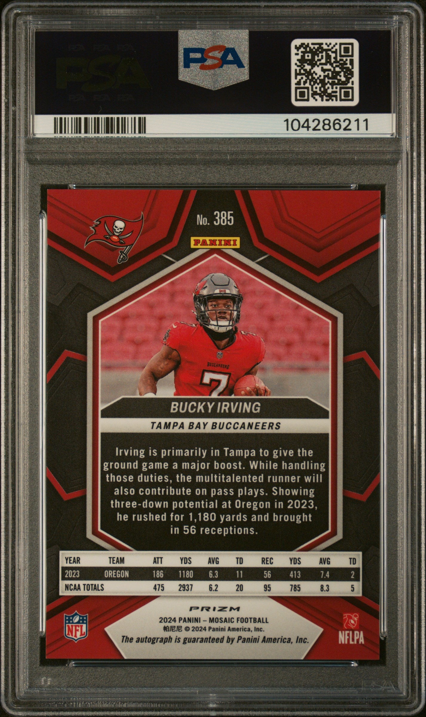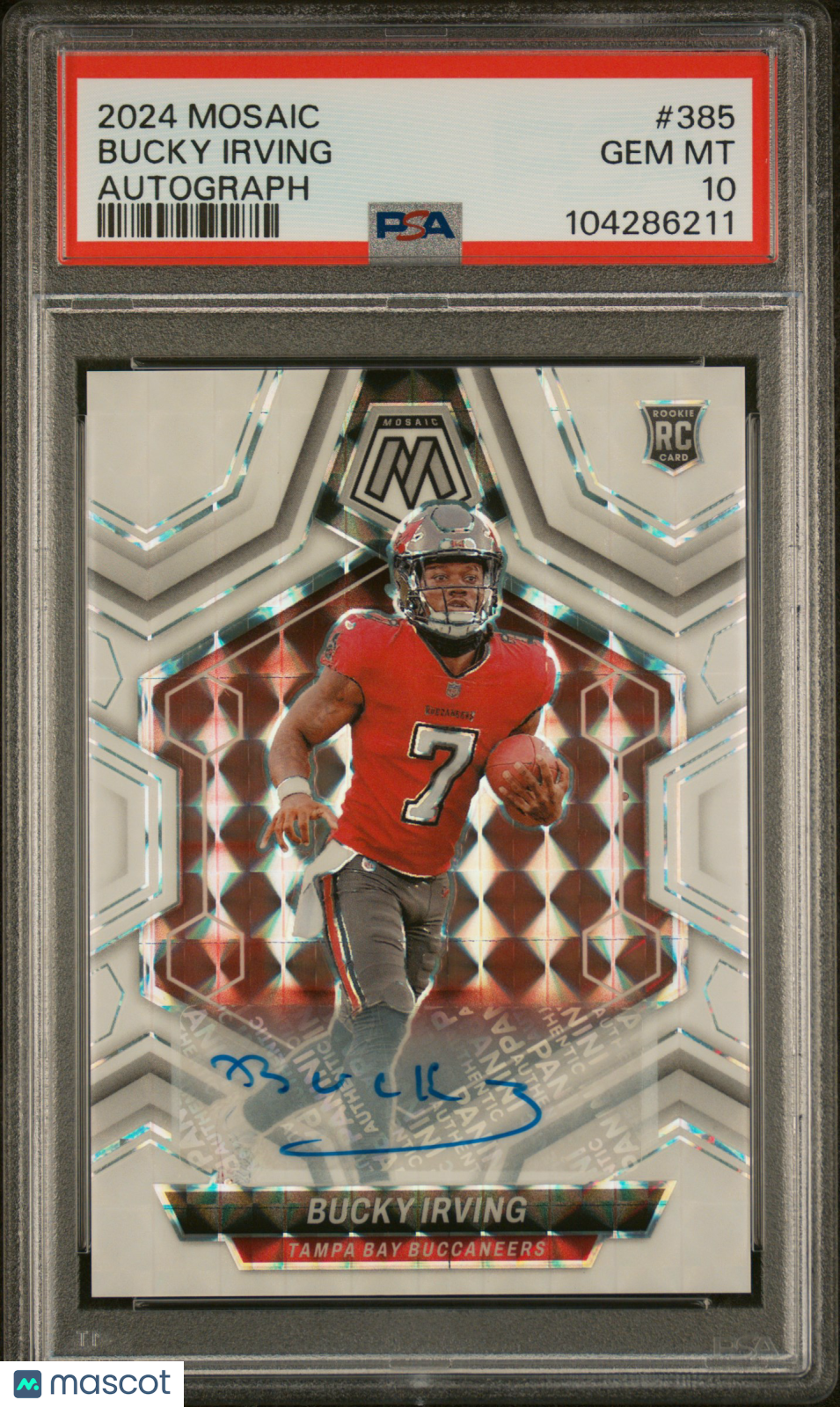 You are purchasing a Bucky Irving 2024 Panini Mosaic #385 White Mosaic Rookie RC Auto PSA10 GEM MT. You will receive the exact card shown in the photos. CONDITION GUARANTEE We provide detailed, high-resolution photos of every card. What you see is exactly what you'll receive. COMPETITIVE PRICING NOTICE Our cards are priced competitively based on current market data and recent sales. We regularly review and adjust our pricing to ensure fair market value for both buyers and collectors. PAYMENT POLICY ATX Cards requires all payments within FOUR (4) DAYS of purchase. Failure to make payment will result in cancellation of the order. SHIPPING All items are packaged with professional protective materials using USPS First Class or Priority. FREE COMBINED SHIPPING on multiple purchases. ABOUT US Based in the heart of Texas, we're passionate about bringing the sports card hobby to life as collectors serving collectors. Whether you're chasing vintage gems from the golden era or ultra-modern slabs fresh from the latest releases, every card in our inventory is hand-selected and thoroughly examined to ensure authenticity, quality, and fair pricing. Listed With Mascot.
