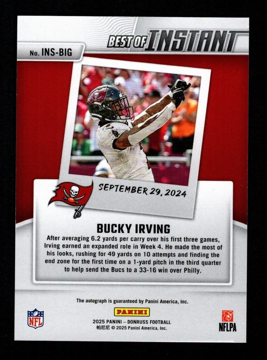 You are purchasing a Bucky Irving 2025 Panini Donruss Best of Instant #INS-BIG Autograph /99 RC Auto. You will receive the exact card shown in the photos. CONDITION GUARANTEE We provide detailed, high-resolution photos of every card. What you see is exactly what you'll receive. COMPETITIVE PRICING NOTICE Our cards are priced competitively based on current market data and recent sales. We regularly review and adjust our pricing to ensure fair market value for both buyers and collectors. PAYMENT POLICY ATX Cards requires all payments within four (4) days of purchase. Failure to make payment will result in cancellation of the order. SHIPPING All items are packaged with professional protective materials using USPS First Class or Priority. FREE COMBINED SHIPPING on multiple purchases. ABOUT US ATX Cards & Collectibles is your trusted Austin, Texas source for sports cards and collectibles. You can find us on our website (www.atxcards.com), eBay, COMC, MyCardPost, Instagram, WhatNot, and at card shows nationwide. Whether you're buying, selling, or trading, we're here to help you build your collection. Listed With Mascot.