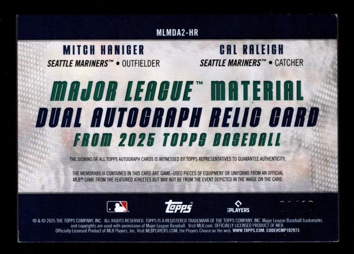 Cal Raleigh/Mitch Haniger 2025 Topps #MLMDA2-HR Dual Game-Used Patch /10 Auto