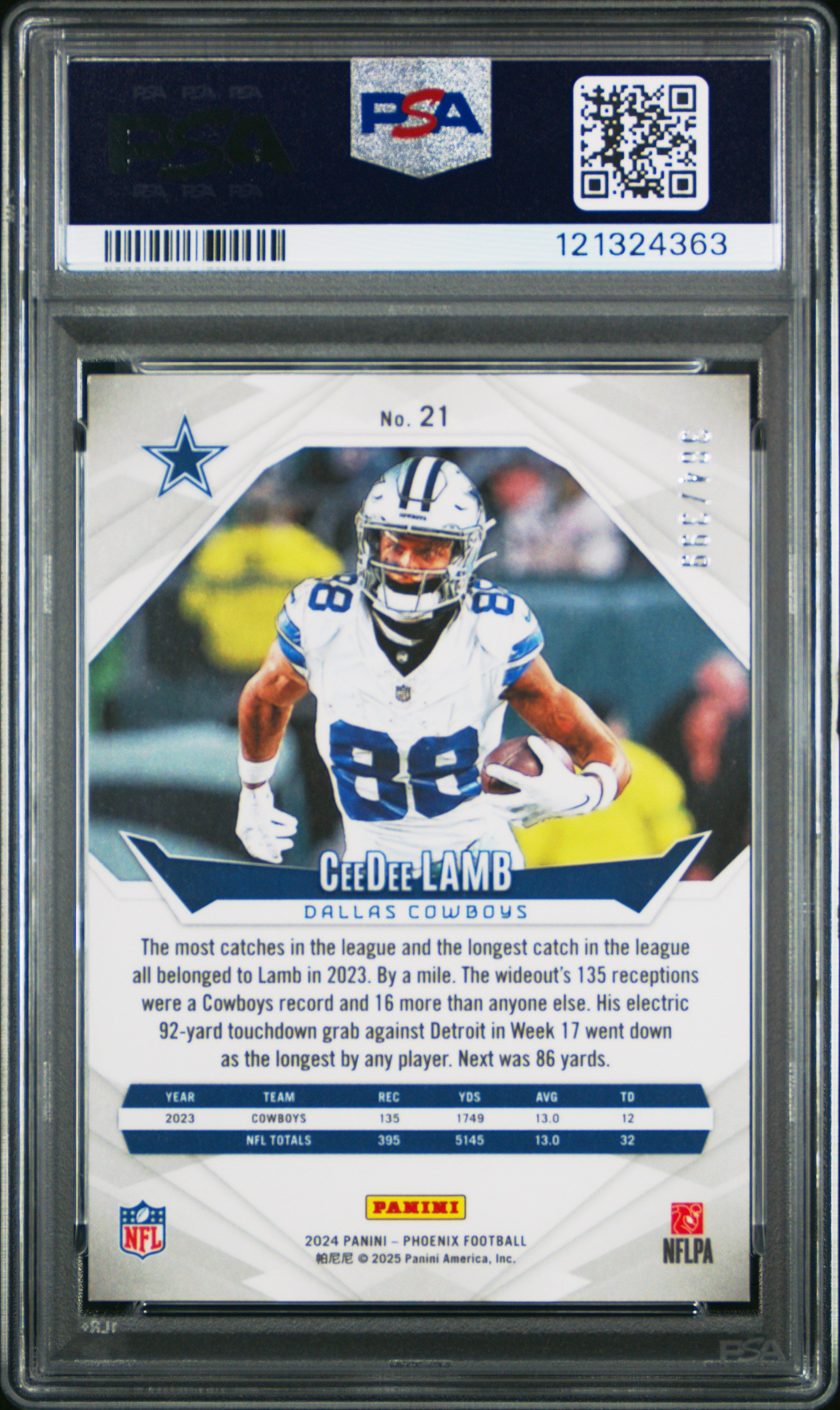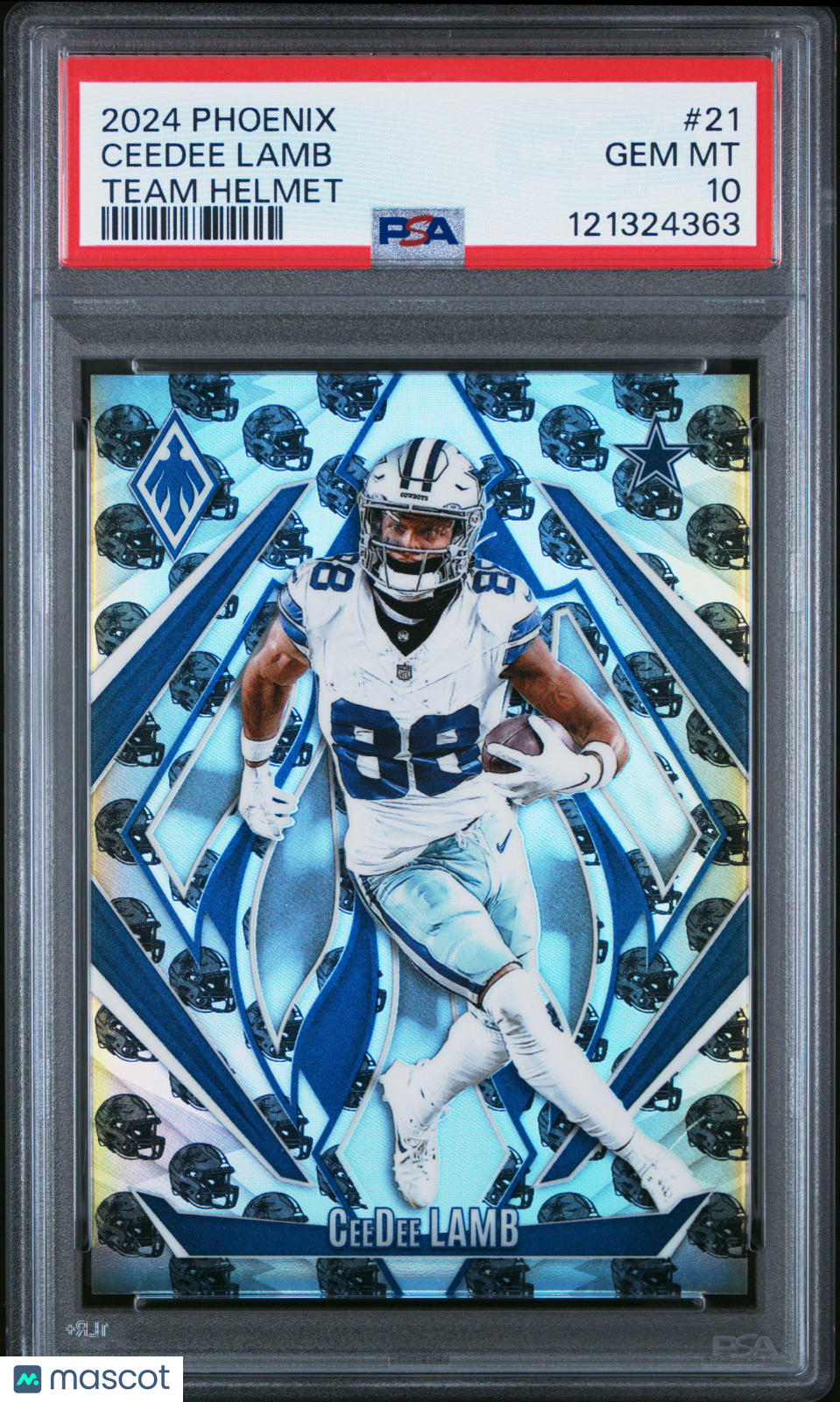 You are purchasing a Ceedee Lamb 2024 Panini Phoenix #21 Team Helmet /399 PSA10 GEM MT. You will receive the exact card shown in the photos. CONDITION GUARANTEE We provide detailed, high-resolution photos of every card. What you see is exactly what you'll receive. COMPETITIVE PRICING NOTICE Our cards are priced competitively based on current market data and recent sales. We regularly review and adjust our pricing to ensure fair market value for both buyers and collectors. PAYMENT POLICY ATX Cards requires all payments within FOUR (4) DAYS of purchase. Failure to make payment will result in cancellation of the order. SHIPPING All items are packaged with professional protective materials using USPS First Class or Priority. FREE COMBINED SHIPPING on multiple purchases. ABOUT US Based in the heart of Texas, we're passionate about bringing the sports card hobby to life as collectors serving collectors. Whether you're chasing vintage gems from the golden era or ultra-modern slabs fresh from the latest releases, every card in our inventory is hand-selected and thoroughly examined to ensure authenticity, quality, and fair pricing. Listed With Mascot.