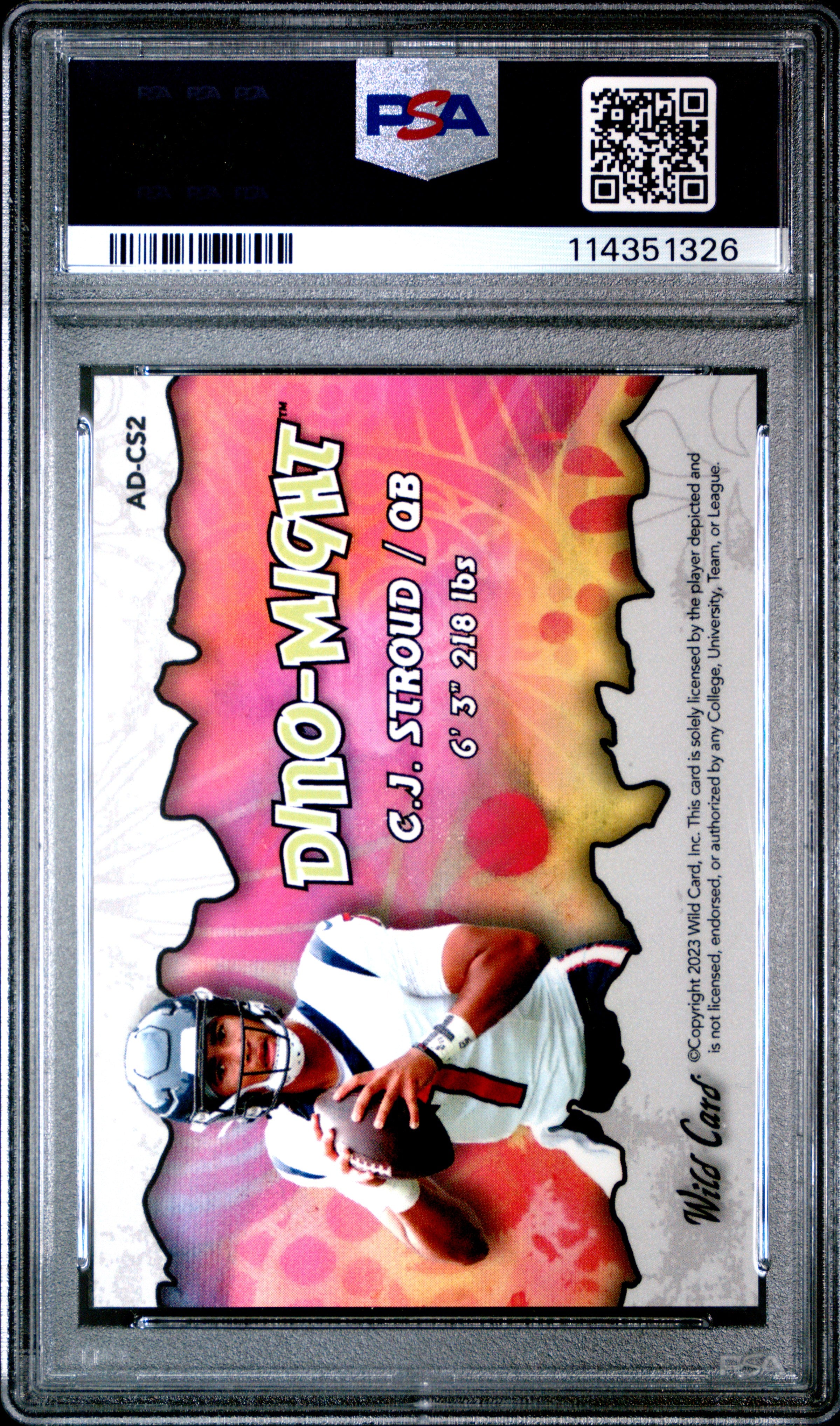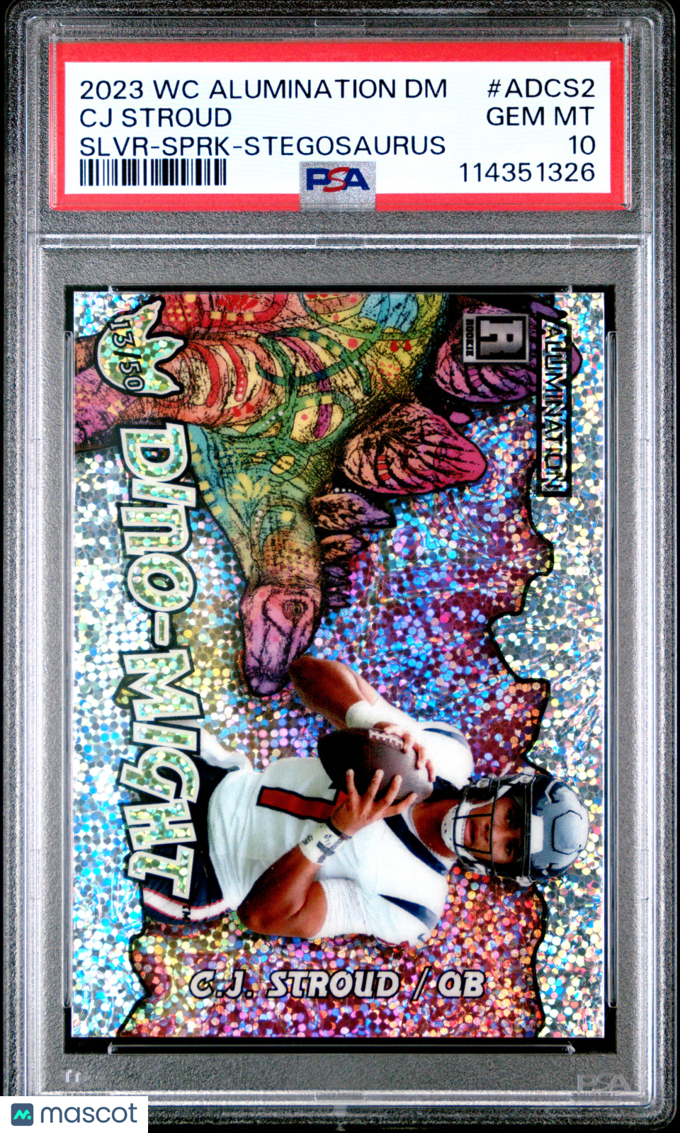 You are purchasing a CJ Stroud 2023 Wild Card Alumination Dino-Might Stegosaurus/50 RC PSA10 GEM MT. You will receive the exact card shown in the photos. CONDITION GUARANTEE We provide detailed, high-resolution photos of every card. What you see is exactly what you'll receive. COMPETITIVE PRICING NOTICE Our cards are priced competitively based on current market data and recent sales. We regularly review and adjust our pricing to ensure fair market value for both buyers and collectors. PAYMENT POLICY ATX Cards requires all payments within four (4) days of purchase. Failure to make payment will result in cancellation of the order. SHIPPING All items are packaged with professional protective materials using USPS First Class or Priority. FREE COMBINED SHIPPING on multiple purchases. ABOUT US ATX Cards & Collectibles is your trusted Austin, Texas source for sports cards and collectibles. You can find us on our website, eBay, COMC, MyCardPost, Instagram, WhatNot, and at card shows nationwide. Whether you're buying, selling, or trading, we're here to help you build your collection. Listed With Mascot.