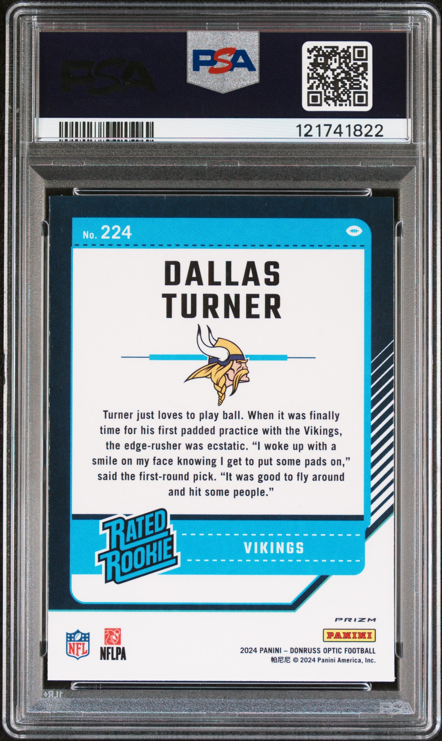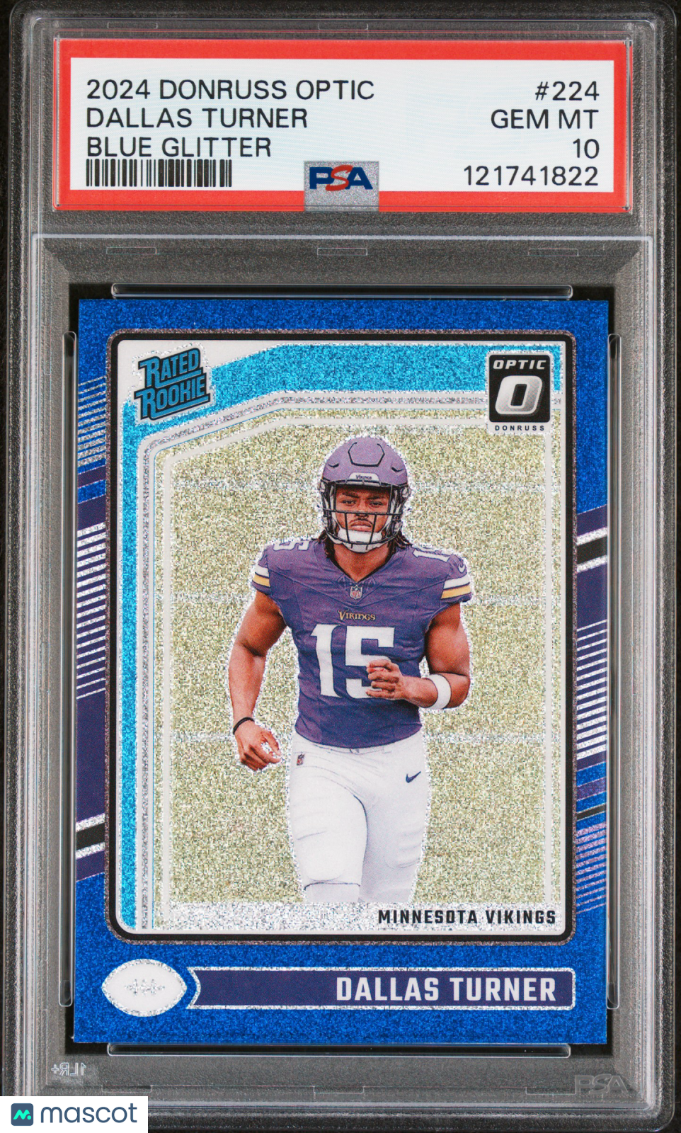 You are purchasing a Dallas Turner 2024 Panini Donruss Optic #224 Blue Glitter RC SSP Case Hit PSA10 GEM MT. You will receive the exact card shown in the photos. CONDITION GUARANTEE We provide detailed, high-resolution photos of every card. What you see is exactly what you'll receive. COMPETITIVE PRICING NOTICE Our cards are priced competitively based on current market data and recent sales. We regularly review and adjust our pricing to ensure fair market value for both buyers and collectors. PAYMENT POLICY ATX Cards requires all payments within FOUR (4) DAYS of purchase. Failure to make payment will result in cancellation of the order. SHIPPING All items are packaged with professional protective materials using USPS First Class or Priority. FREE COMBINED SHIPPING on multiple purchases. ABOUT US Based in the heart of Texas, we're passionate about bringing the sports card hobby to life as collectors serving collectors. Whether you're chasing vintage gems from the golden era or ultra-modern slabs fresh from the latest releases, every card in our inventory is hand-selected and thoroughly examined to ensure authenticity, quality, and fair pricing. Listed With Mascot.