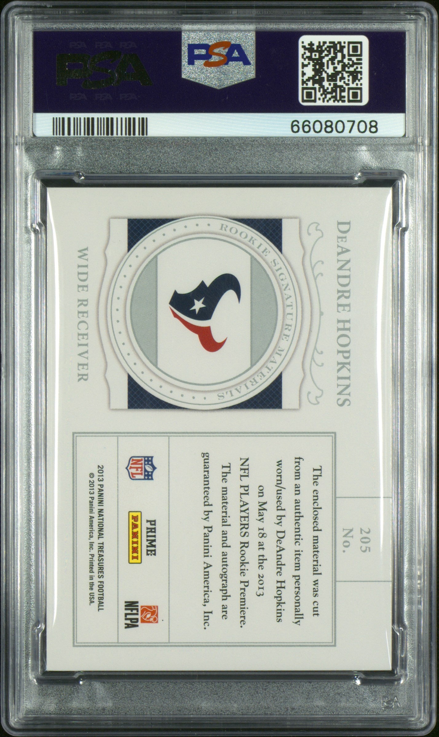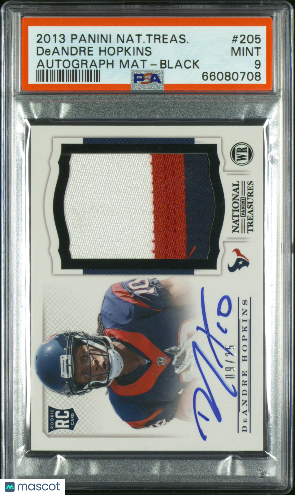 You are purchasing a DeAndre Hopkins 2013 National Treasures #205 Rookie Patch /25 RC Auto PSA9 MINT. You will receive the exact card shown in the photos. CONDITION GUARANTEE We provide detailed, high-resolution photos of every card. What you see is exactly what you'll receive. COMPETITIVE PRICING NOTICE Our cards are priced competitively based on current market data and recent sales. We regularly review and adjust our pricing to ensure fair market value for both buyers and collectors. PAYMENT POLICY ATX Cards requires all payments within FOUR (4) DAYS of purchase. Failure to make payment will result in cancellation of the order. SHIPPING All items are packaged with professional protective materials using USPS First Class or Priority. FREE COMBINED SHIPPING on multiple purchases. ABOUT US Based in the heart of Texas, we're passionate about bringing the sports card hobby to life as collectors serving collectors. Whether you're chasing vintage gems from the golden era or ultra-modern slabs fresh from the latest releases, every card in our inventory is hand-selected and thoroughly examined to ensure authenticity, quality, and fair pricing. Listed With Mascot.