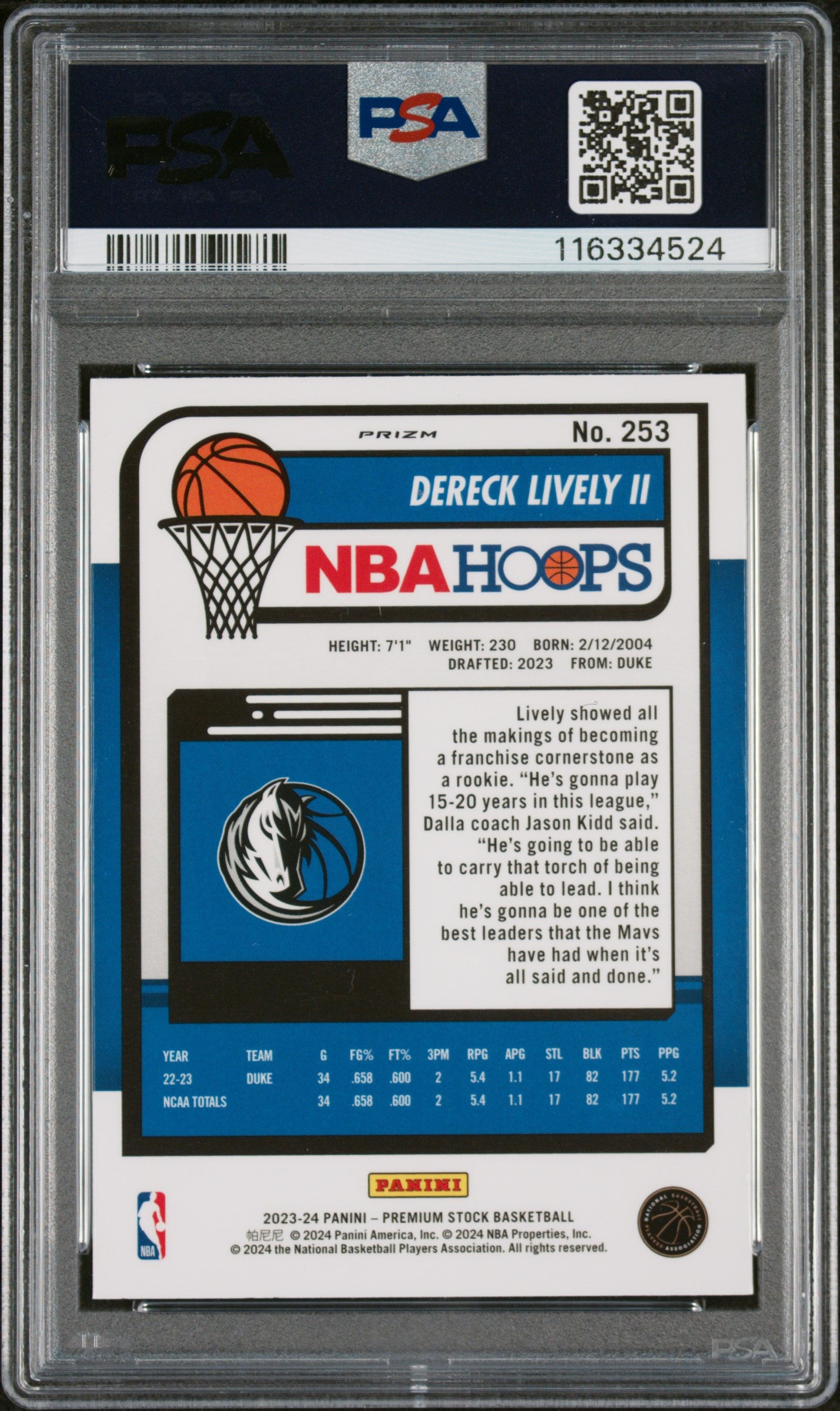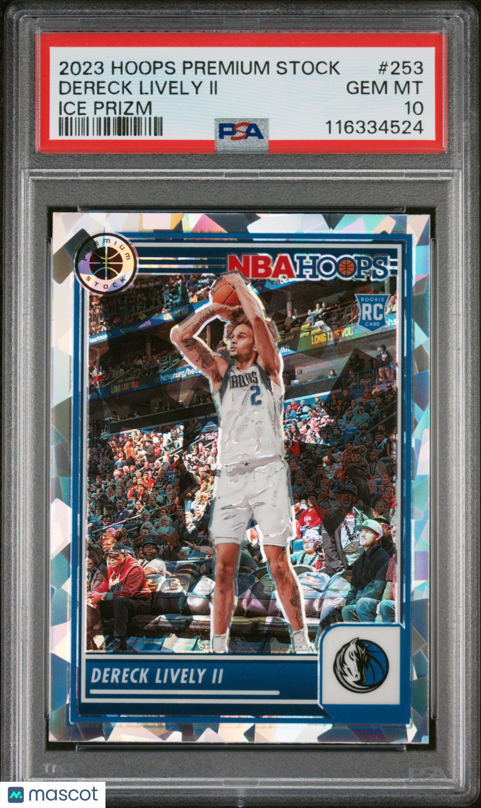 You are purchasing a Dereck Lively II 2023-24 Panini Hoops Premium Stock #253 Ice RC PSA10 GEM MT. You will receive the exact card shown in the photos. CONDITION GUARANTEE We provide detailed, high-resolution photos of every card. What you see is exactly what you'll receive. COMPETITIVE PRICING NOTICE Our cards are priced competitively based on current market data and recent sales. We regularly review and adjust our pricing to ensure fair market value for both buyers and collectors. PAYMENT POLICY ATX Cards requires all payments within FOUR (4) DAYS of purchase. Failure to make payment will result in cancellation of the order. SHIPPING All items are packaged with professional protective materials using USPS First Class or Priority. FREE COMBINED SHIPPING on multiple purchases. ABOUT US Based in the heart of Texas, we're passionate about bringing the sports card hobby to life as collectors serving collectors. Whether you're chasing vintage gems from the golden era or ultra-modern slabs fresh from the latest releases, every card in our inventory is hand-selected and thoroughly examined to ensure authenticity, quality, and fair pricing. Listed With Mascot.