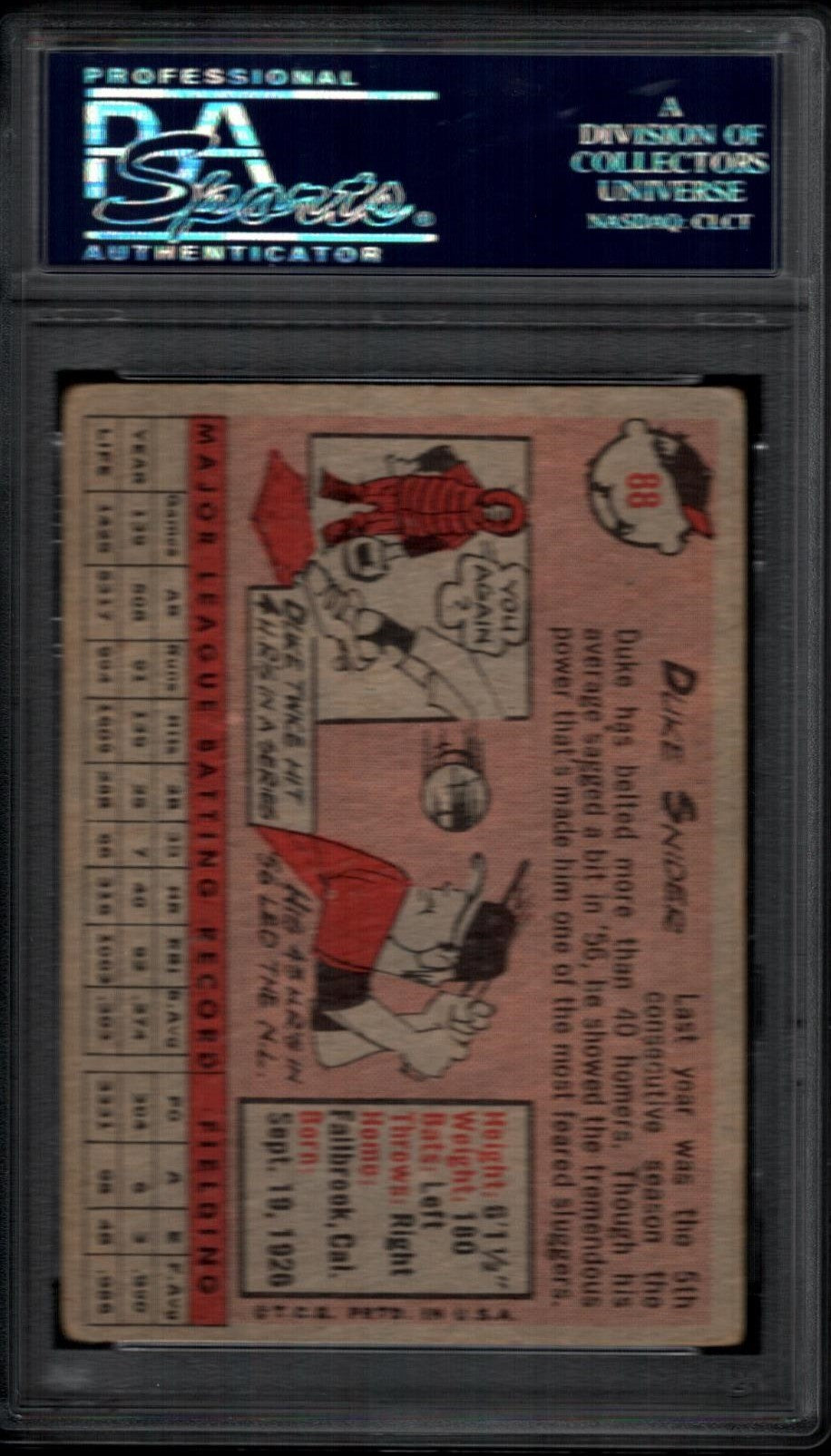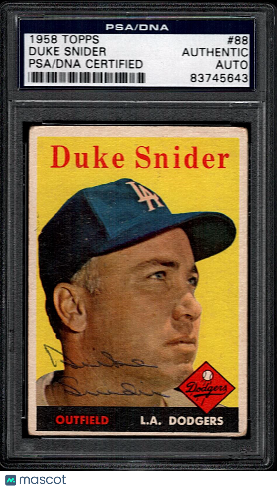 You are purchasing a Duke Snider 1958 Topps #88 HOF In Person Auto PSA/DNA Authentic Dodgers. You will receive the exact card in the photos. All unsolicited inquiries such as "What is your best price?" will not receive a response. Our pricing is competitive and based on recent comps, typically reflecting the last three sales. Payment Policies ATX Cards require all payments to be made in 48 hours unless prior approval or waiting on a combined shipping invoice. Return Policy ATX Cards does NOT accept returns. Shipping ATX Cards ships most cards using USPS First Class or Priority. We combine shipping on all purchases and can send you a combined shipping invoice when ready. About Us ATX Cards is Austin's go-to destination for a curated selection of unique cards and collectibles at competitive prices. Follow us on IG @atxcardscollectibles. Listed With Mascot.