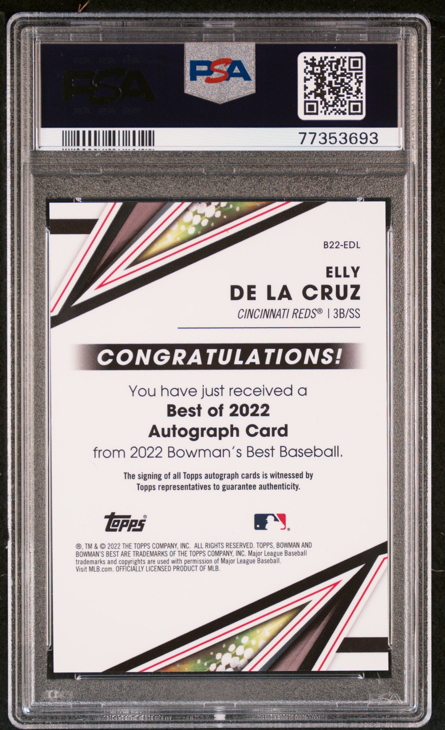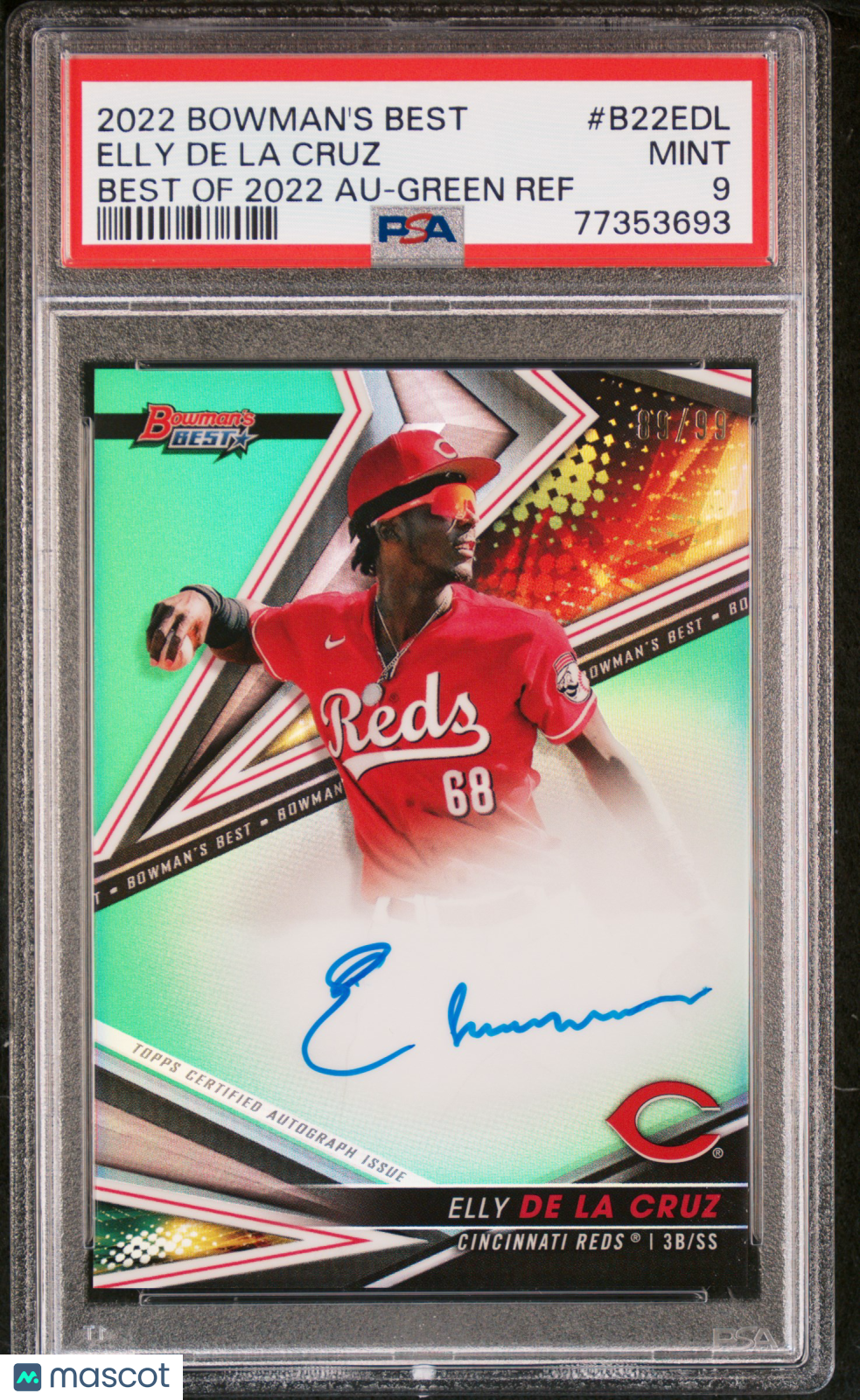 You are purchasing a Elly De La Cruz 2022 Bowman's Best #B22EDL Best Of 2022 Autograph Green Refractor PSA 9Elly De La Cruz 2022 Bowman's Best #B22EDL Green Refractor /99 Auto PSA9 MINTotos. CONDITION GUARANTEE We provide detailed, high-resolution photos of every card. What you see is exactly what you'll receive. COMPETITIVE PRICING NOTICE Our cards are priced competitively based on current market data and recent sales. We regularly review and adjust our pricing to ensure fair market value for both buyers and collectors. PAYMENT POLICY ATX Cards requires all payments within four (4) days of purchase. Failure to make payment will result in cancellation of the order. SHIPPING All items are packaged with professional protective materials using USPS First Class or Priority. FREE COMBINED SHIPPING on multiple purchases. ABOUT US ATX Cards and Collectibles is your trusted Austin, Texas source for sports cards and collectibles. You can find us on our website, eBay, COMC, MyCardPost, Instagram, WhatNot, and at card shows nationwide. Whether you're buying, selling, or trading, we're here to help you build your collection. Listed With Mascot.