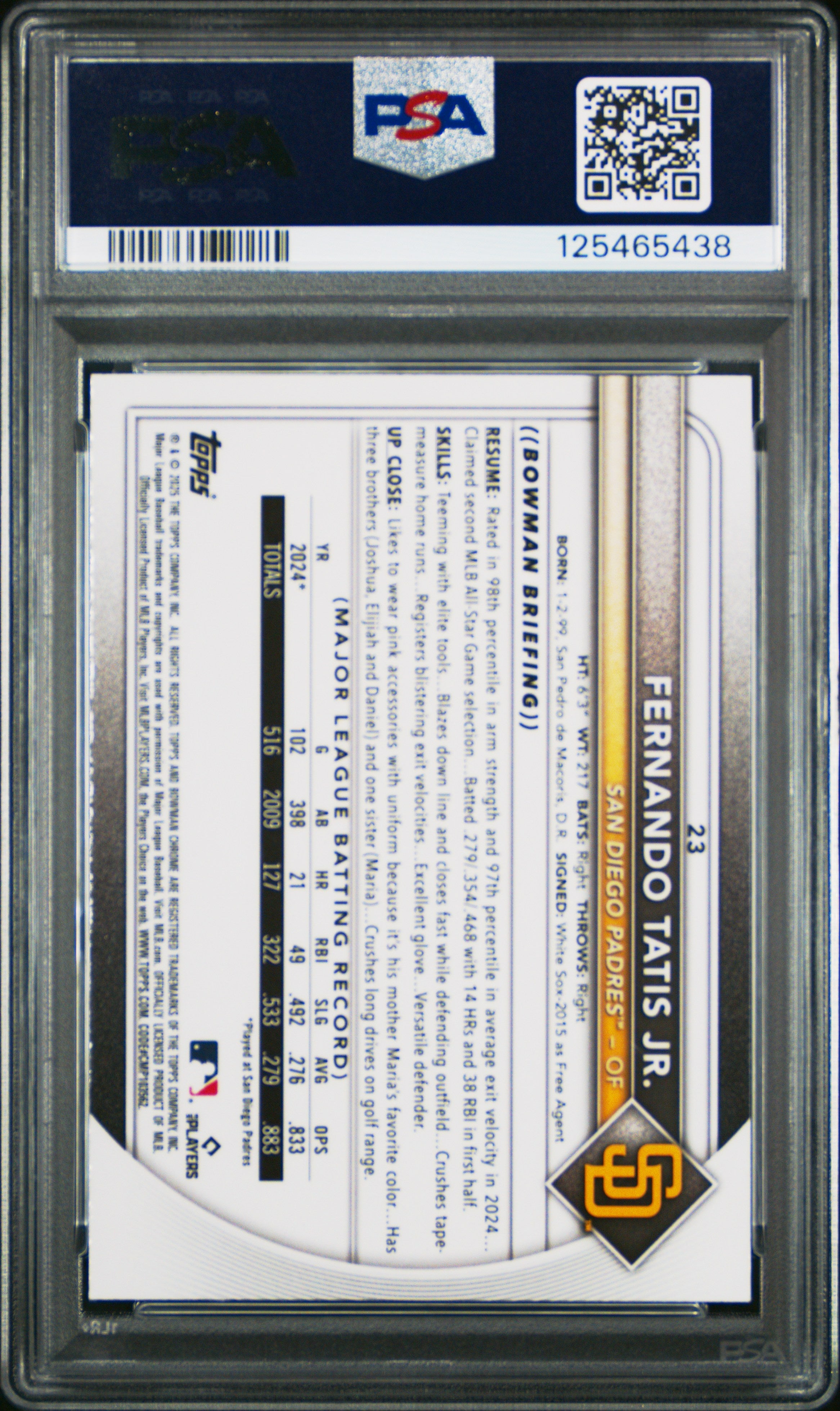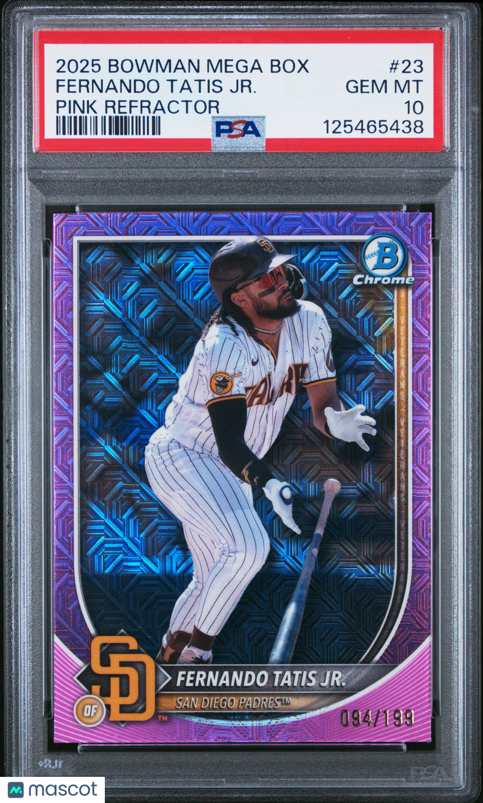 You are purchasing a Fernando Tatis Jr. 2025 Bowman Mega Box #23 Pink Refractor /199 PSA10 GEM MT. You will receive the exact card shown in the photos. CONDITION GUARANTEE We provide detailed, high-resolution photos of every card. What you see is exactly what you'll receive. COMPETITIVE PRICING NOTICE Our cards are priced competitively based on current market data and recent sales. We regularly review and adjust our pricing to ensure fair market value for both buyers and collectors. PAYMENT POLICY ATX Cards requires all payments within FOUR (4) DAYS of purchase. Failure to make payment will result in cancellation of the order. SHIPPING All items are packaged with professional protective materials using USPS First Class or Priority. FREE COMBINED SHIPPING on multiple purchases. ABOUT US Based in the heart of Texas, we're passionate about bringing the sports card hobby to life as collectors serving collectors. Whether you're chasing vintage gems from the golden era or ultra-modern slabs fresh from the latest releases, every card in our inventory is hand-selected and thoroughly examined to ensure authenticity, quality, and fair pricing. Listed With Mascot.