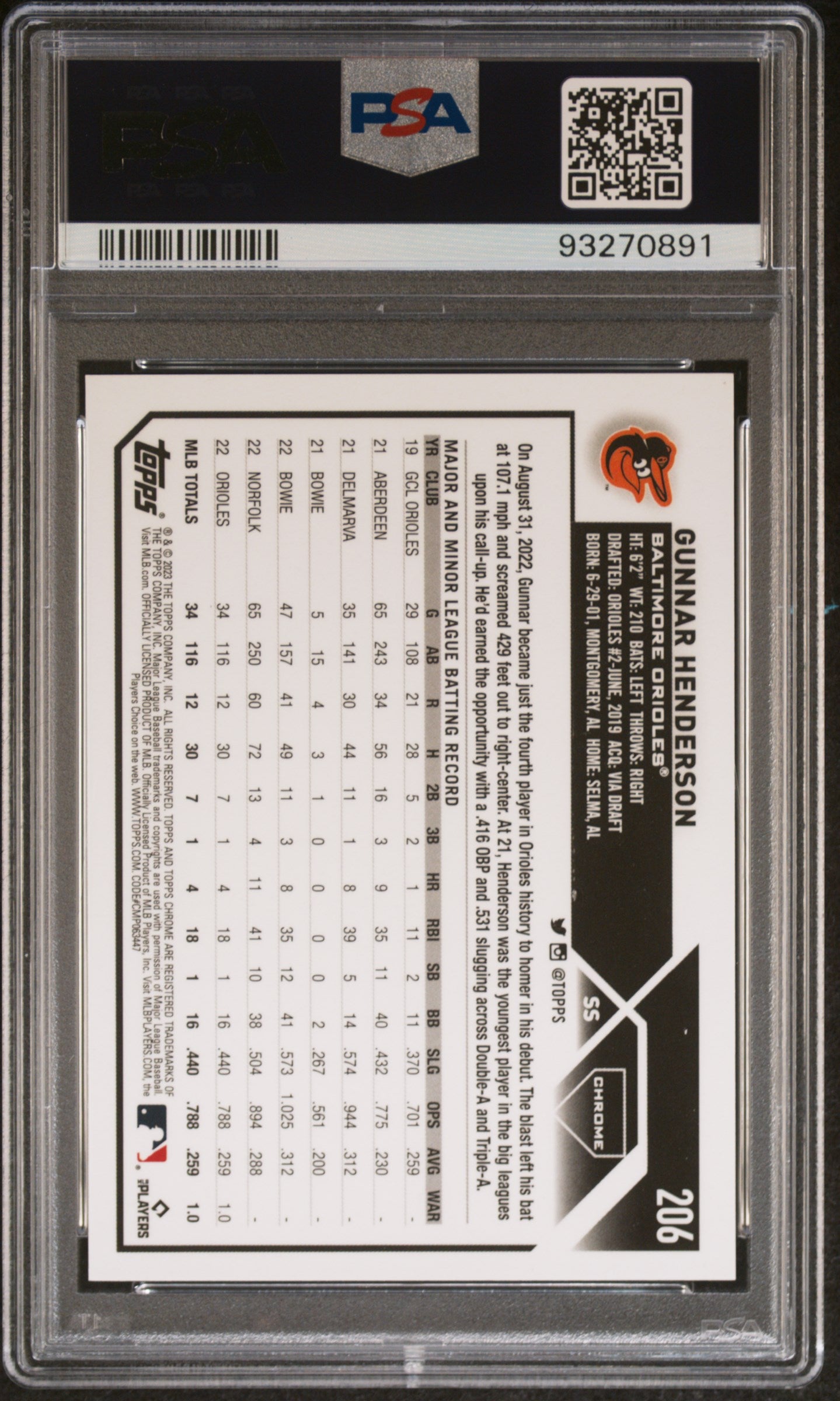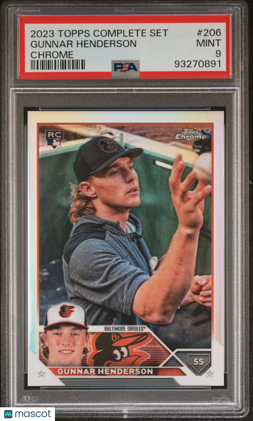 You are purchasing a Gunnar Henderson 2023 Topps Complete Set #206 Chrome Variation RC PSA9 MINT. You will receive the exact card shown in the photos. CONDITION GUARANTEE We provide detailed, high-resolution photos of every card. What you see is exactly what you'll receive. COMPETITIVE PRICING NOTICE Our cards are priced competitively based on current market data and recent sales. We regularly review and adjust our pricing to ensure fair market value for both buyers and collectors. PAYMENT POLICY ATX Cards requires all payments within FOUR (4) DAYS of purchase. Failure to make payment will result in cancellation of the order. SHIPPING All items are packaged with professional protective materials using USPS First Class or Priority. FREE COMBINED SHIPPING on multiple purchases. ABOUT US Based in the heart of Texas, we're passionate about bringing the sports card hobby to life as collectors serving collectors. Whether you're chasing vintage gems from the golden era or ultra-modern slabs fresh from the latest releases, every card in our inventory is hand-selected and thoroughly examined to ensure authenticity, quality, and fair pricing. Listed With Mascot.