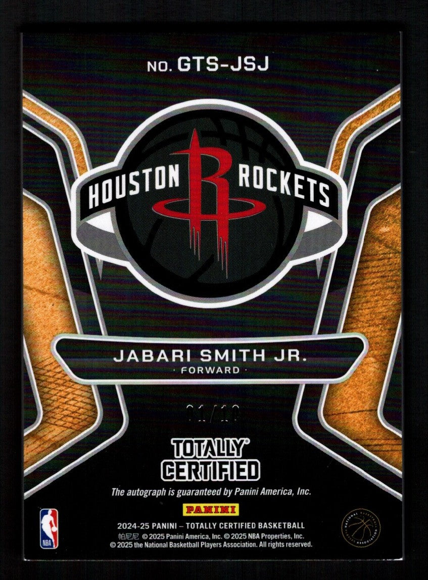 You are purchasing a Jabari Smith Jr. 2025 Panini Totally Certified Gold Team Gold Mirror /10 Auto. You will receive the exact card shown in the photos. There is minor wear on the back two bottom corners. CONDITION GUARANTEE We provide detailed, high-resolution photos of every card. What you see is exactly what you'll receive. COMPETITIVE PRICING NOTICE Our cards are priced competitively based on current market data and recent sales. We regularly review and adjust our pricing to ensure fair market value for both buyers and collectors. PAYMENT POLICY ATX Cards requires all payments within four (4) days of purchase. Failure to make payment will result in cancellation of the order. SHIPPING All items are packaged with professional protective materials using USPS First Class or Priority. FREE COMBINED SHIPPING on multiple purchases. ABOUT US ATX Cards & Collectibles is your trusted Austin, Texas source for sports cards and collectibles. You can find us on our website, eBay, COMC, MyCardPost, Instagram, WhatNot, and at card shows nationwide. Whether you're buying, selling, or trading, we're here to help you build your collection. Listed With Mascot.