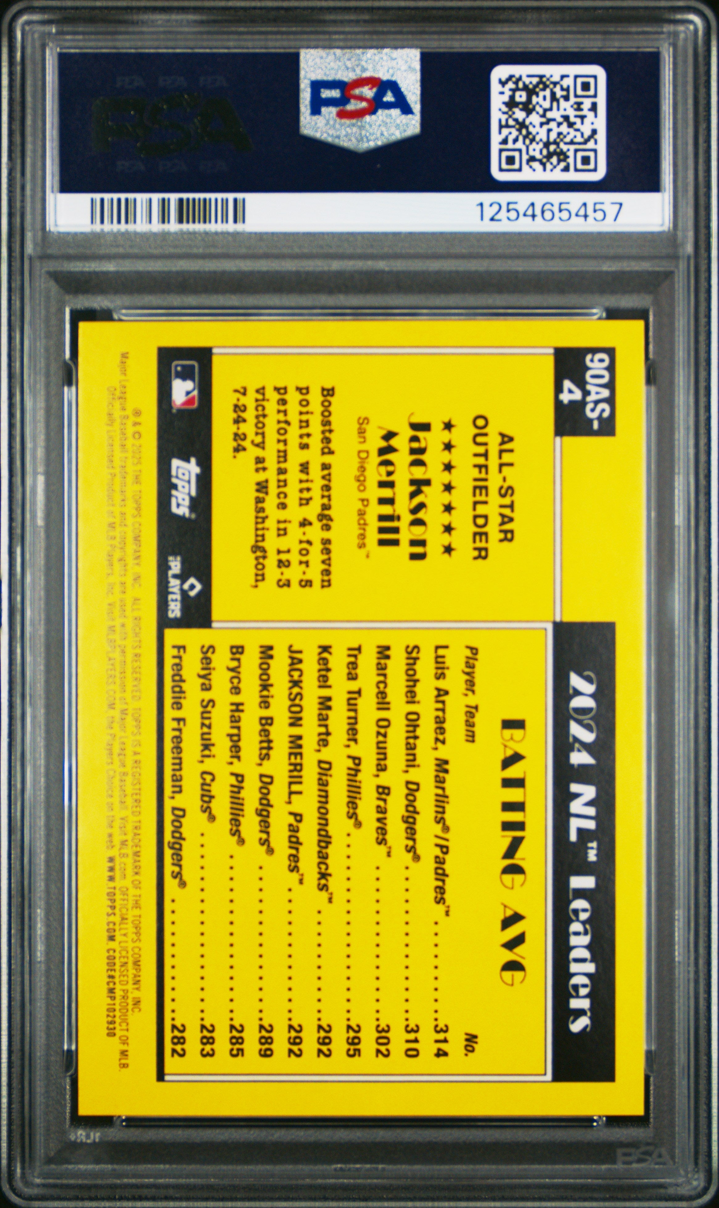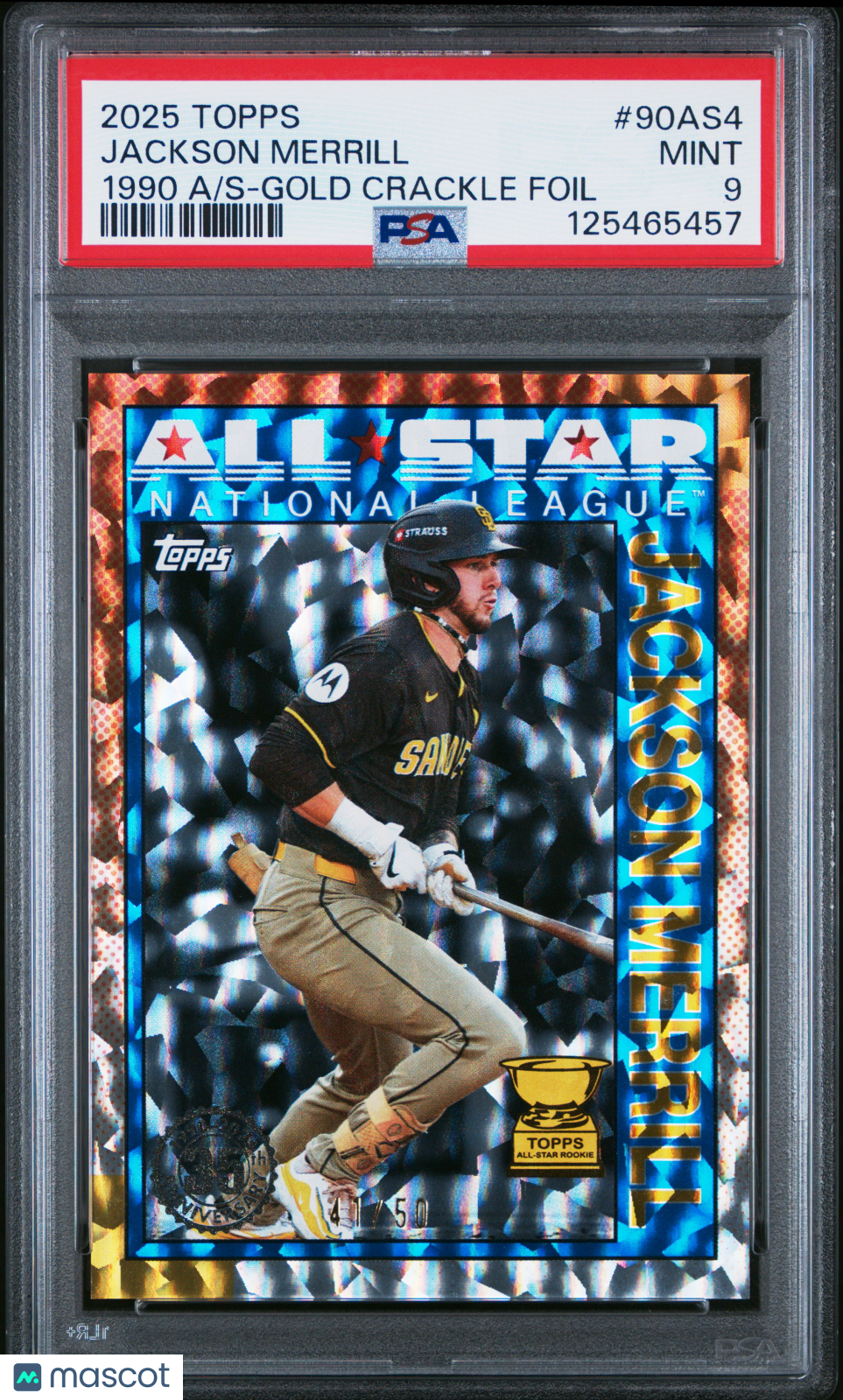You are purchasing a Jackson Merrill 2025 Topps #90AS4 Topps All-Star Gold Crackle Foil /50 PSA9 MINT. You will receive the exact card shown in the photos. CONDITION GUARANTEE We provide detailed, high-resolution photos of every card. What you see is exactly what you'll receive. COMPETITIVE PRICING NOTICE Our cards are priced competitively based on current market data and recent sales. We regularly review and adjust our pricing to ensure fair market value for both buyers and collectors. PAYMENT POLICY ATX Cards requires all payments within four (4) days of purchase. Failure to make payment will result in cancellation of the order. SHIPPING All items are packaged with professional protective materials using USPS First Class or Priority. FREE COMBINED SHIPPING on multiple purchases. ABOUT US ATX Cards & Collectibles is your trusted Austin, Texas source for sports cards and collectibles. You can find us on our website, eBay, COMC, MyCardPost, Instagram, WhatNot, and at card shows nationwide. Whether you're buying, selling, or trading, we're here to help you build your collection. Listed With Mascot.