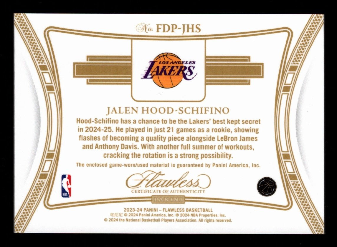 You are purchasing a Jalen Hood-Schifino 2024-25 Panini Flawless #FDP-JHS Ruby Dual Patch /15 RC Lakers. You will receive the exact card shown in the photos. CONDITION GUARANTEE We provide detailed, high-resolution photos of every card. What you see is exactly what you'll receive. COMPETITIVE PRICING NOTICE Our cards are priced competitively based on current market data and recent sales. We regularly review and adjust our pricing to ensure fair market value for both buyers and collectors. PAYMENT POLICY ATX Cards requires all payments within four (4) days of purchase. Failure to make payment will result in cancellation of the order. SHIPPING All items are packaged with professional protective materials using USPS First Class or Priority. FREE COMBINED SHIPPING on multiple purchases. ABOUT US ATX Cards & Collectibles is your trusted Austin, Texas source for sports cards and collectibles. You can find us on our website, eBay, COMC, MyCardPost, Instagram, WhatNot, and at card shows nationwide. Whether you're buying, selling, or trading, we're here to help you build your collection. Listed With Mascot.