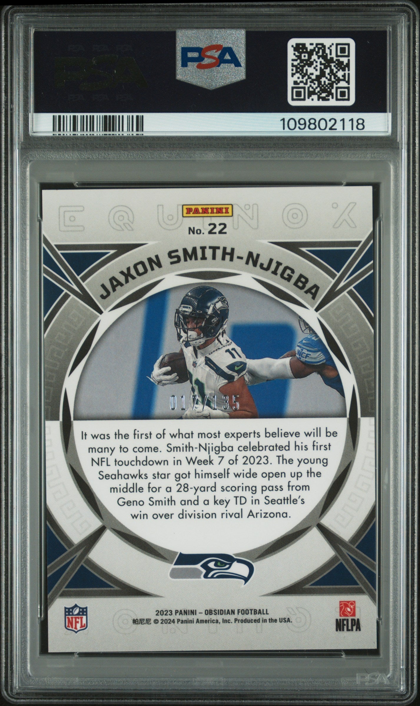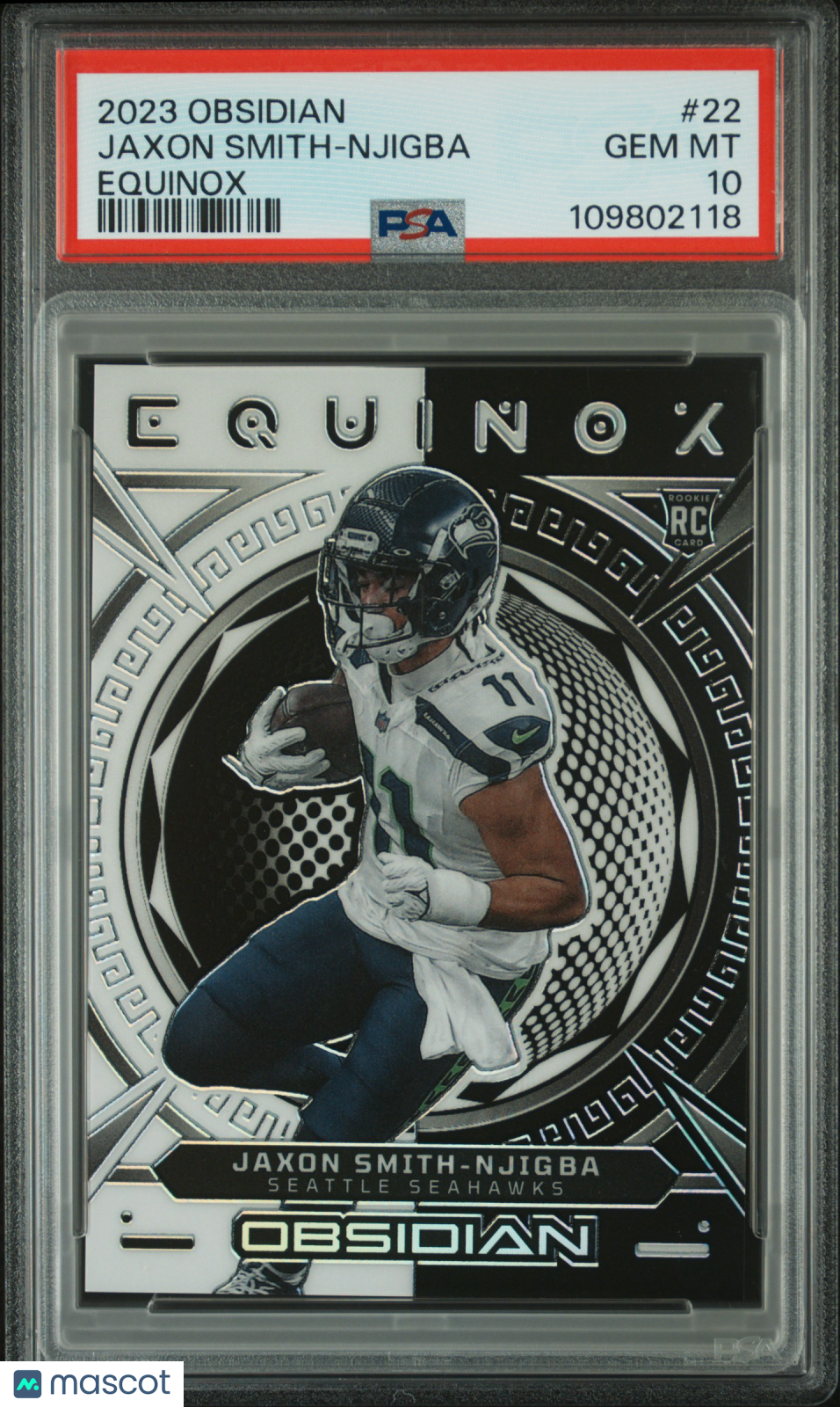 You are purchasing a Jaxon Smith-Njigba 2023 Panini Obsidian #22 Equinox /135 RC PSA10 GEM MT. You will receive the exact card shown in the photos. CONDITION GUARANTEE We provide detailed, high-resolution photos of every card. What you see is exactly what you'll receive. COMPETITIVE PRICING NOTICE Our cards are priced competitively based on current market data and recent sales. We regularly review and adjust our pricing to ensure fair market value for both buyers and collectors. PAYMENT POLICY ATX Cards requires all payments within four (4) days of purchase. Failure to make payment will result in cancellation of the order. SHIPPING All items are packaged with professional protective materials using USPS First Class or Priority. FREE COMBINED SHIPPING on multiple purchases. ABOUT US ATX Cards & Collectibles is your trusted Austin, Texas source for sports cards and collectibles. You can find us on our website, eBay, COMC, MyCardPost, Instagram, WhatNot, and at card shows nationwide. Whether you're buying, selling, or trading, we're here to help you build your collection. Listed With Mascot.