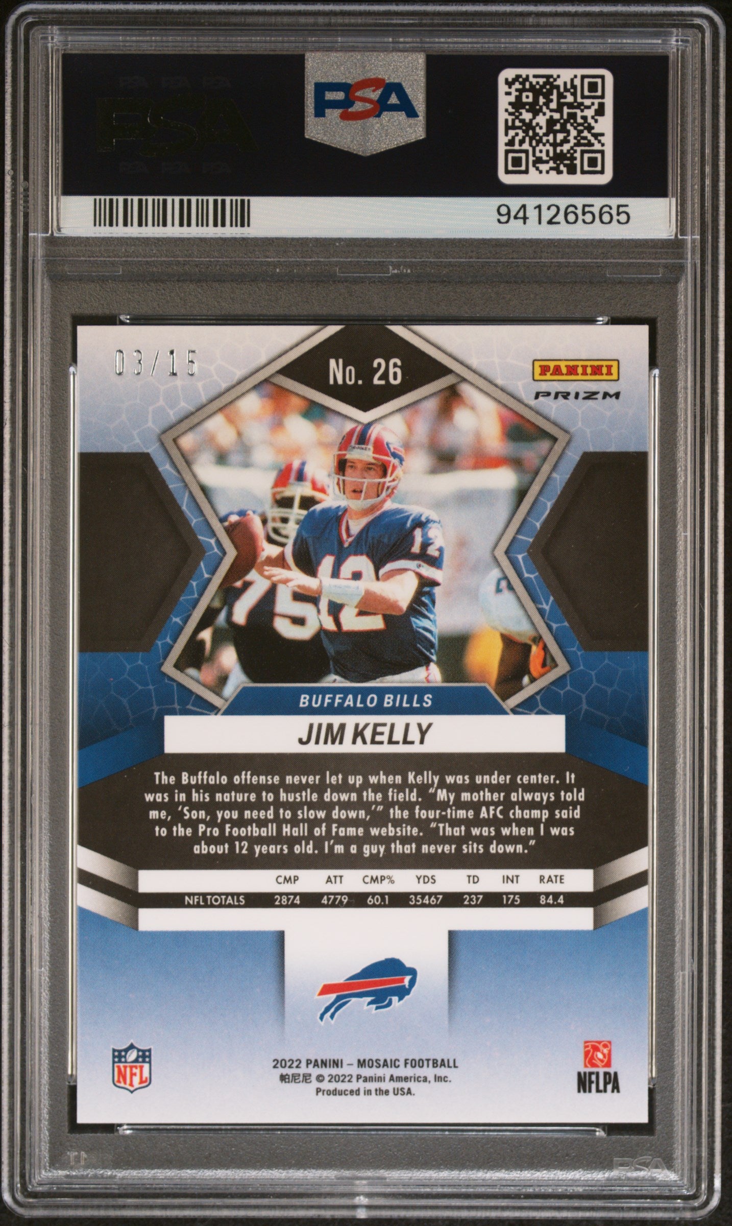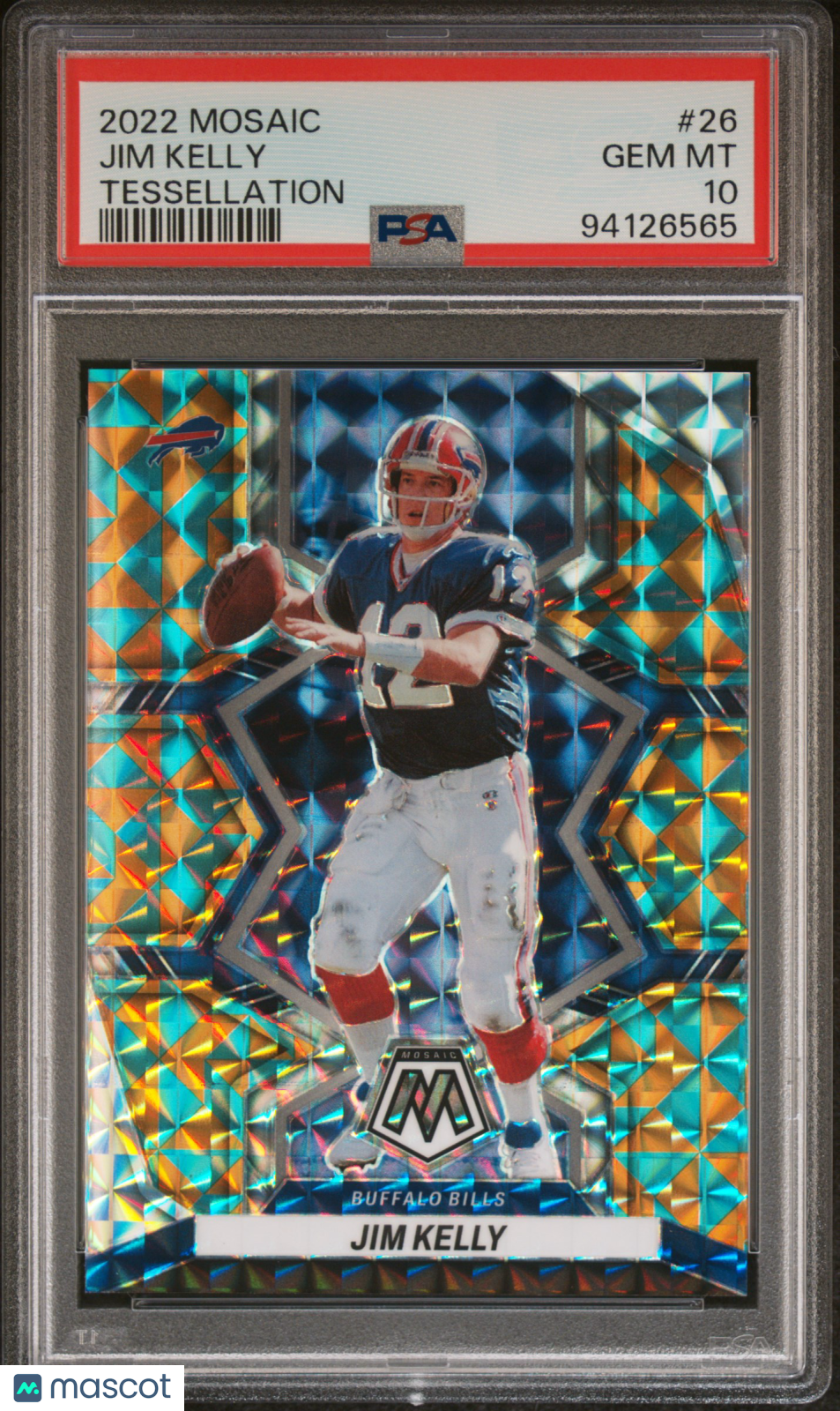 You are purchasing a Jim Kelly 2022 Panini Mosaic #26 Tessellation /15 SSP PSA10 GEM MT. You will receive the exact card shown in the photos. CONDITION GUARANTEE We provide detailed, high-resolution photos of every card. What you see is exactly what you'll receive. COMPETITIVE PRICING NOTICE Our cards are priced competitively based on current market data and recent sales. We regularly review and adjust our pricing to ensure fair market value for both buyers and collectors. PAYMENT POLICY ATX Cards requires all payments within FOUR (4) DAYS of purchase. Failure to make payment will result in cancellation of the order. SHIPPING All items are packaged with professional protective materials using USPS First Class or Priority. FREE COMBINED SHIPPING on multiple purchases. ABOUT US Based in the heart of Texas, we're passionate about bringing the sports card hobby to life as collectors serving collectors. Whether you're chasing vintage gems from the golden era or ultra-modern slabs fresh from the latest releases, every card in our inventory is hand-selected and thoroughly examined to ensure authenticity, quality, and fair pricing. Listed With Mascot.
