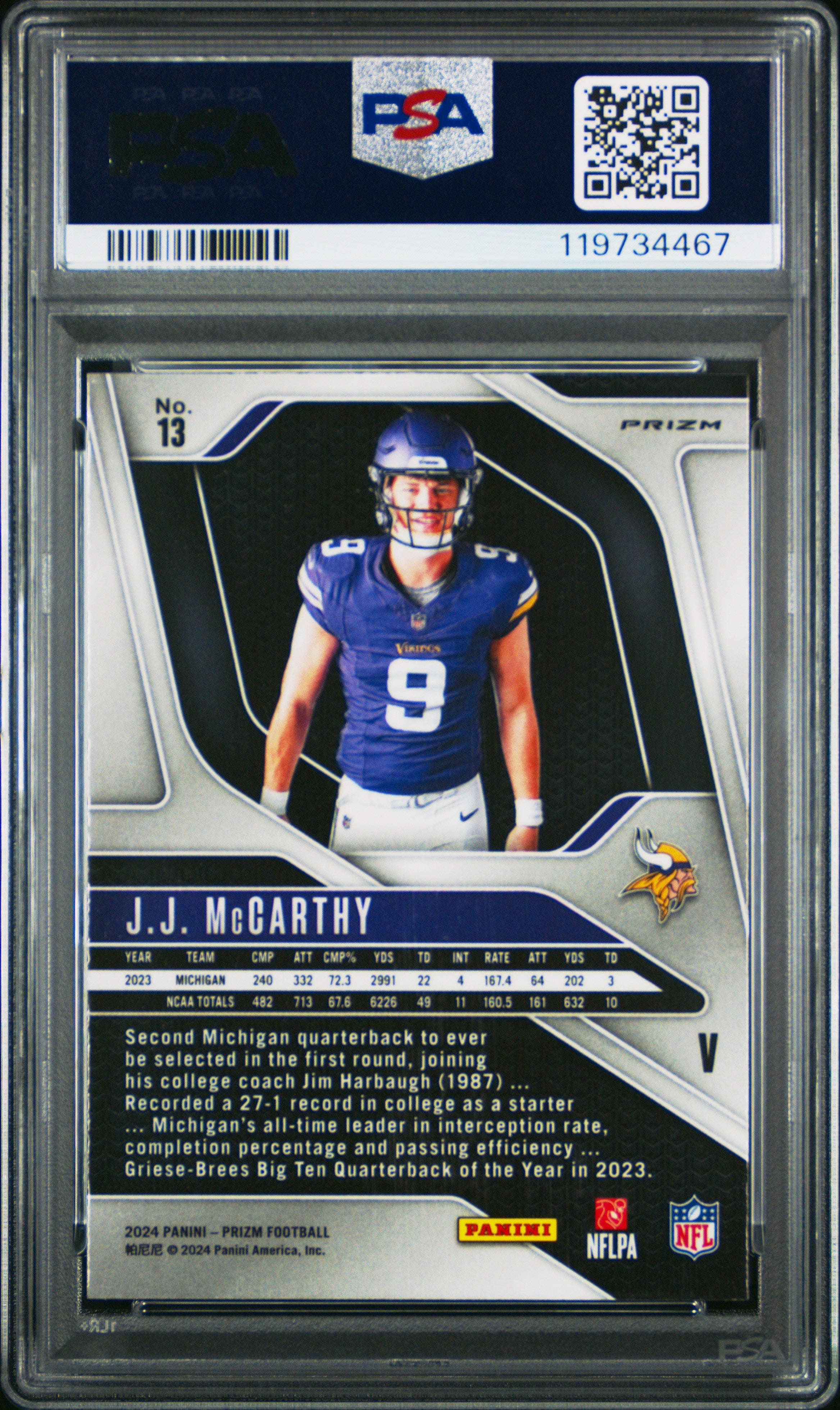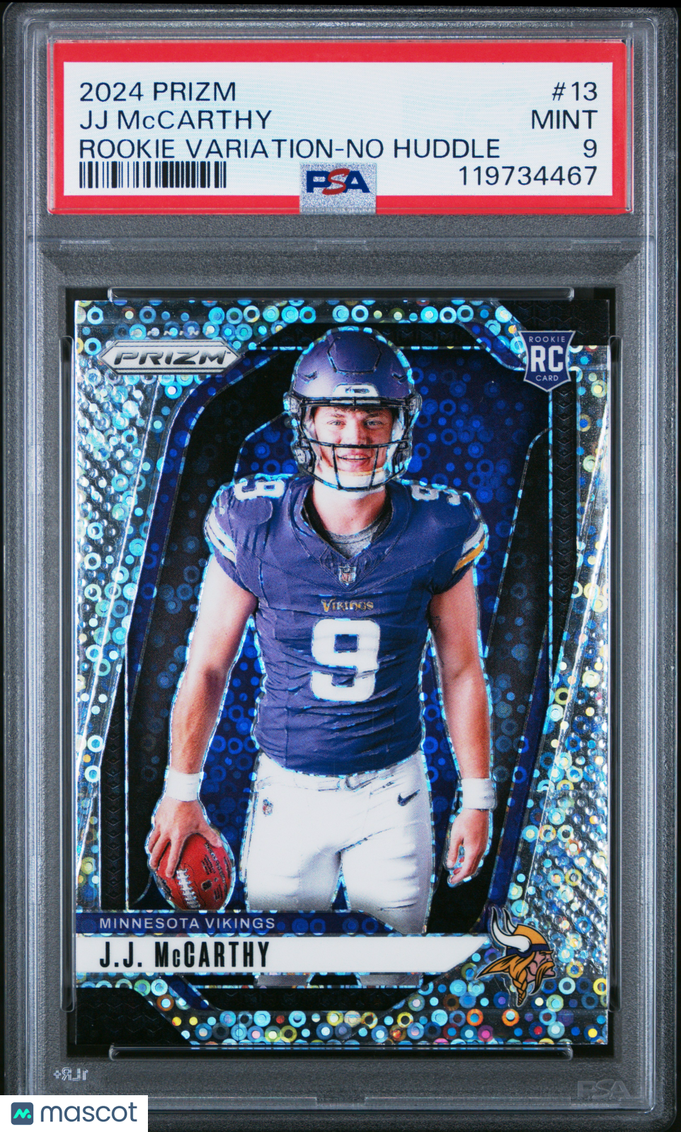 You are purchasing a JJ McCarthy 2024 Panini Prizm #13 Rookie Variation No Huddle RC PSA9 MINT. You will receive the exact card shown in the photos. CONDITION GUARANTEE We provide detailed, high-resolution photos of every card. What you see is exactly what you'll receive. COMPETITIVE PRICING NOTICE Our cards are priced competitively based on current market data and recent sales. We regularly review and adjust our pricing to ensure fair market value for both buyers and collectors. PAYMENT POLICY ATX Cards requires all payments within four (4) days of purchase. Failure to make payment will result in cancellation of the order. SHIPPING All items are packaged with professional protective materials using USPS First Class or Priority. FREE COMBINED SHIPPING on multiple purchases. ABOUT US ATX Cards & Collectibles is your trusted Austin, Texas source for sports cards and collectibles. You can find us on our website, eBay, COMC, MyCardPost, Instagram, WhatNot, and at card shows nationwide. Whether you're buying, selling, or trading, we're here to help you build your collection. Listed With Mascot.