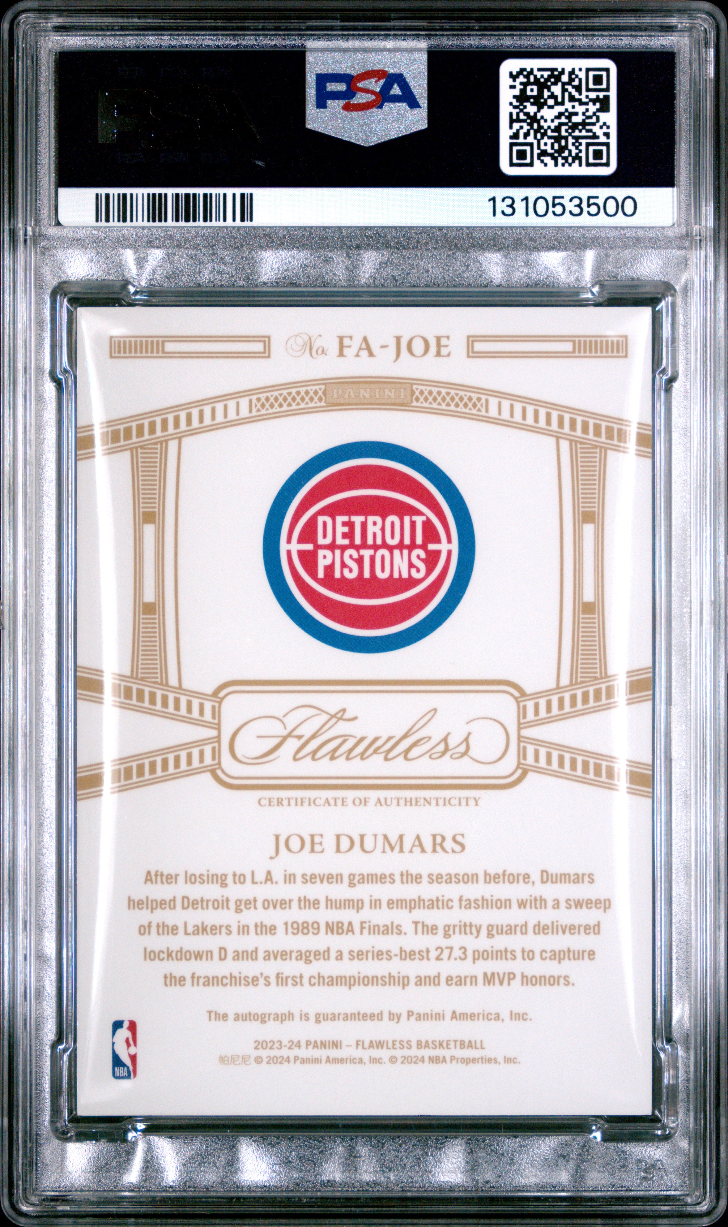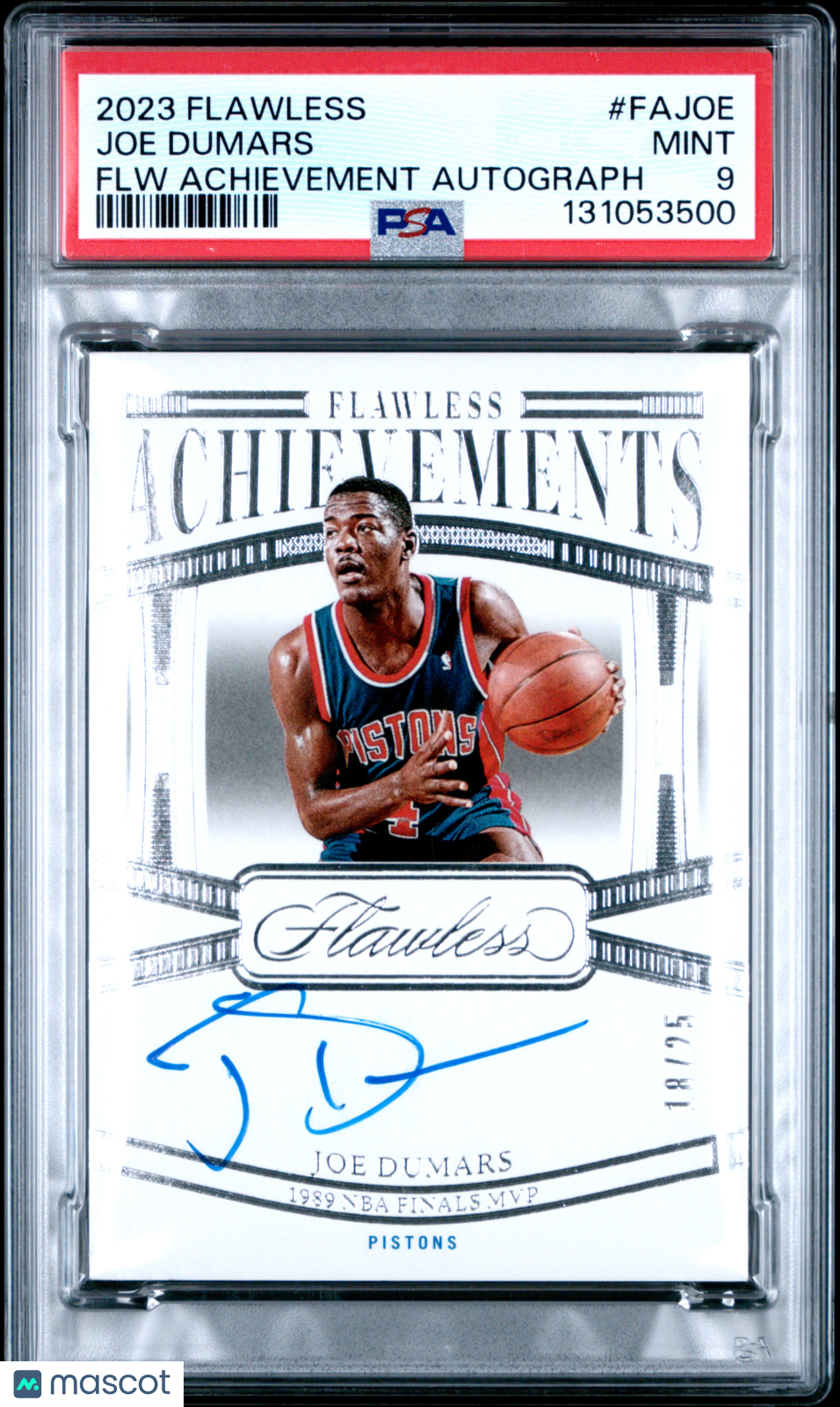 You are purchasing a Joe Dumars 2023 Panini Flawless #FAJOE Flawless Achievements /25 Auto PSA9 MINT. You will receive the exact card shown in the photos. CONDITION GUARANTEE We provide detailed, high-resolution photos of every card. What you see is exactly what you'll receive. COMPETITIVE PRICING NOTICE Our cards are priced competitively based on current market data and recent sales. We regularly review and adjust our pricing to ensure fair market value for both buyers and collectors. PAYMENT POLICY ATX Cards requires all payments within four (4) days of purchase. Failure to make payment will result in cancellation of the order. SHIPPING All items are packaged with professional protective materials using USPS First Class or Priority. FREE COMBINED SHIPPING on multiple purchases. ABOUT US ATX Cards & Collectibles is your trusted Austin, Texas source for sports cards and collectibles. You can find us on our website, eBay, COMC, MyCardPost, Instagram, WhatNot, and at card shows nationwide. Whether you're buying, selling, or trading, we're here to help you build your collection. Listed With Mascot.