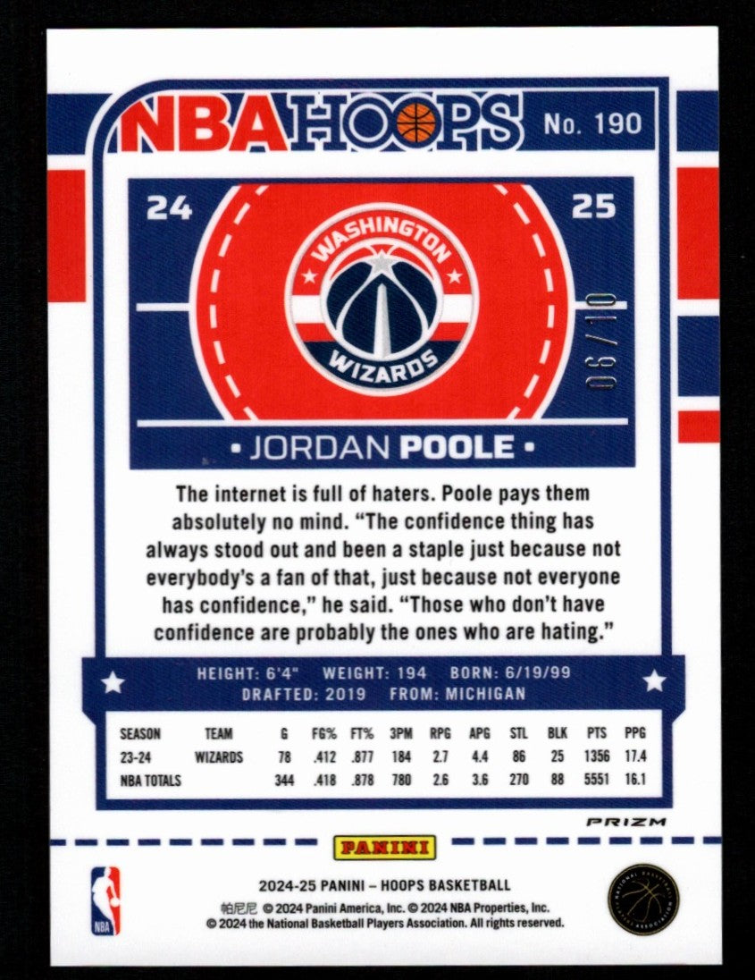 You are purchasing a Jordan Poole 2024-25 Panini NBA Hoops #190 Gold Prizm /10 Wizards. You will receive the exact card shown in the photos. CONDITION GUARANTEE We provide detailed, high-resolution photos of every card. What you see is exactly what you'll receive. COMPETITIVE PRICING NOTICE Our cards are priced competitively based on current market data and recent sales. We regularly review and adjust our pricing to ensure fair market value for both buyers and collectors. PAYMENT POLICY ATX Cards requires all payments within four (4) days of purchase. Failure to make payment will result in cancellation of the order. SHIPPING All items are packaged with professional protective materials using USPS First Class or Priority. FREE COMBINED SHIPPING on multiple purchases. ABOUT US ATX Cards & Collectibles is your trusted Austin, Texas source for sports cards and collectibles. You can find us on our website, eBay, COMC, MyCardPost, Instagram, WhatNot, and at card shows nationwide. Whether you're buying, selling, or trading, we're here to help you build your collection. Listed With Mascot.