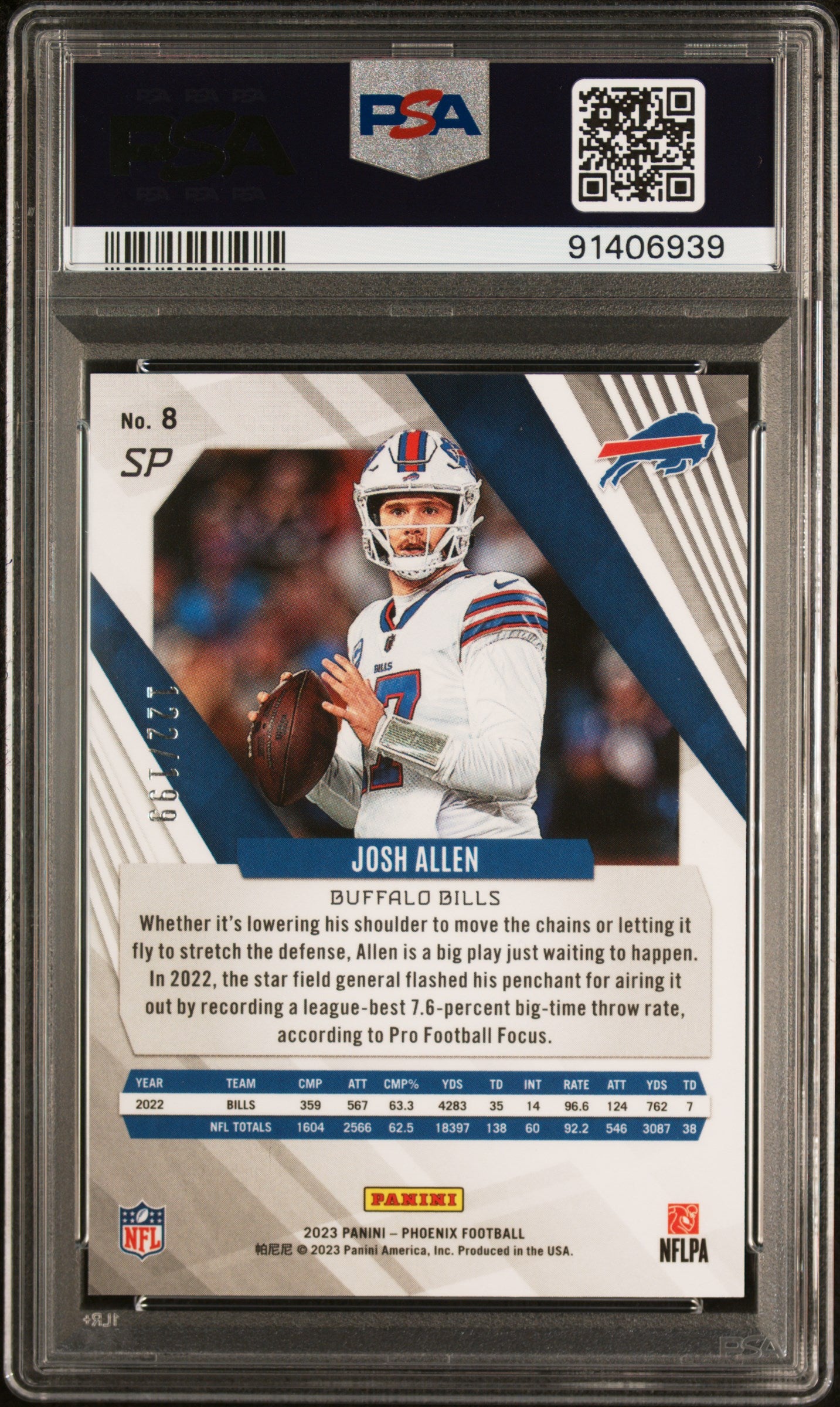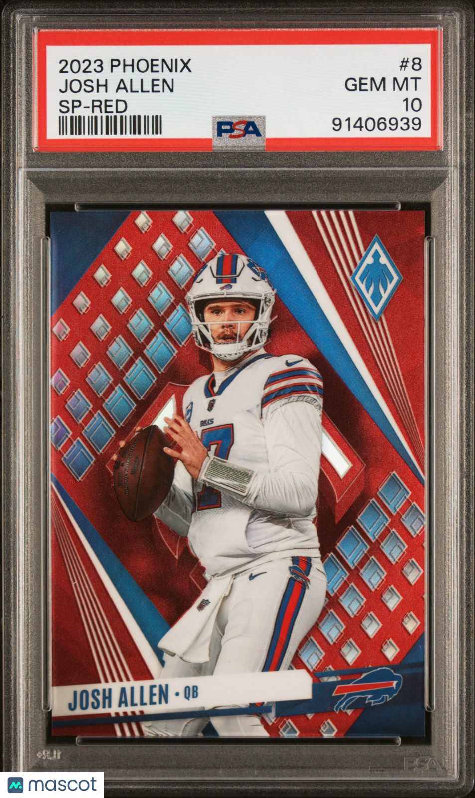 You are purchasing a Josh Allen 2023 Panini Phoenix #8 SP Red /199 PSA10 GEM MT. You will receive the exact card shown in the photos. CONDITION GUARANTEE We provide detailed, high-resolution photos of every card. What you see is exactly what you'll receive. COMPETITIVE PRICING NOTICE Our cards are priced competitively based on current market data and recent sales. We regularly review and adjust our pricing to ensure fair market value for both buyers and collectors. PAYMENT POLICY ATX Cards requires all payments within FOUR (4) DAYS of purchase. Failure to make payment will result in cancellation of the order. SHIPPING All items are packaged with professional protective materials using USPS First Class or Priority. FREE COMBINED SHIPPING on multiple purchases. ABOUT US Based in the heart of Texas, we're passionate about bringing the sports card hobby to life as collectors serving collectors. Whether you're chasing vintage gems from the golden era or ultra-modern slabs fresh from the latest releases, every card in our inventory is hand-selected and examined to ensure authenticity, quality, and fair pricing. Listed With Mascot.