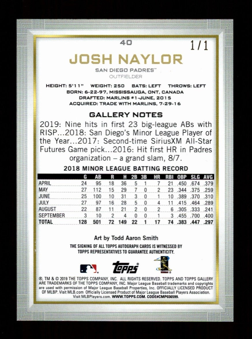 Josh Naylor 2019 Topps Gallery #40 Red Autographs 1/1 Rookie RC Auto Padres