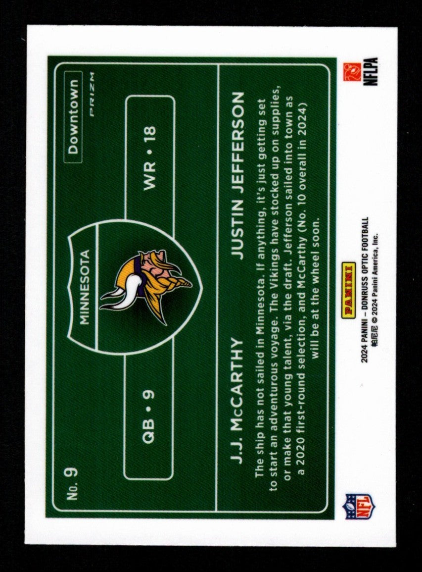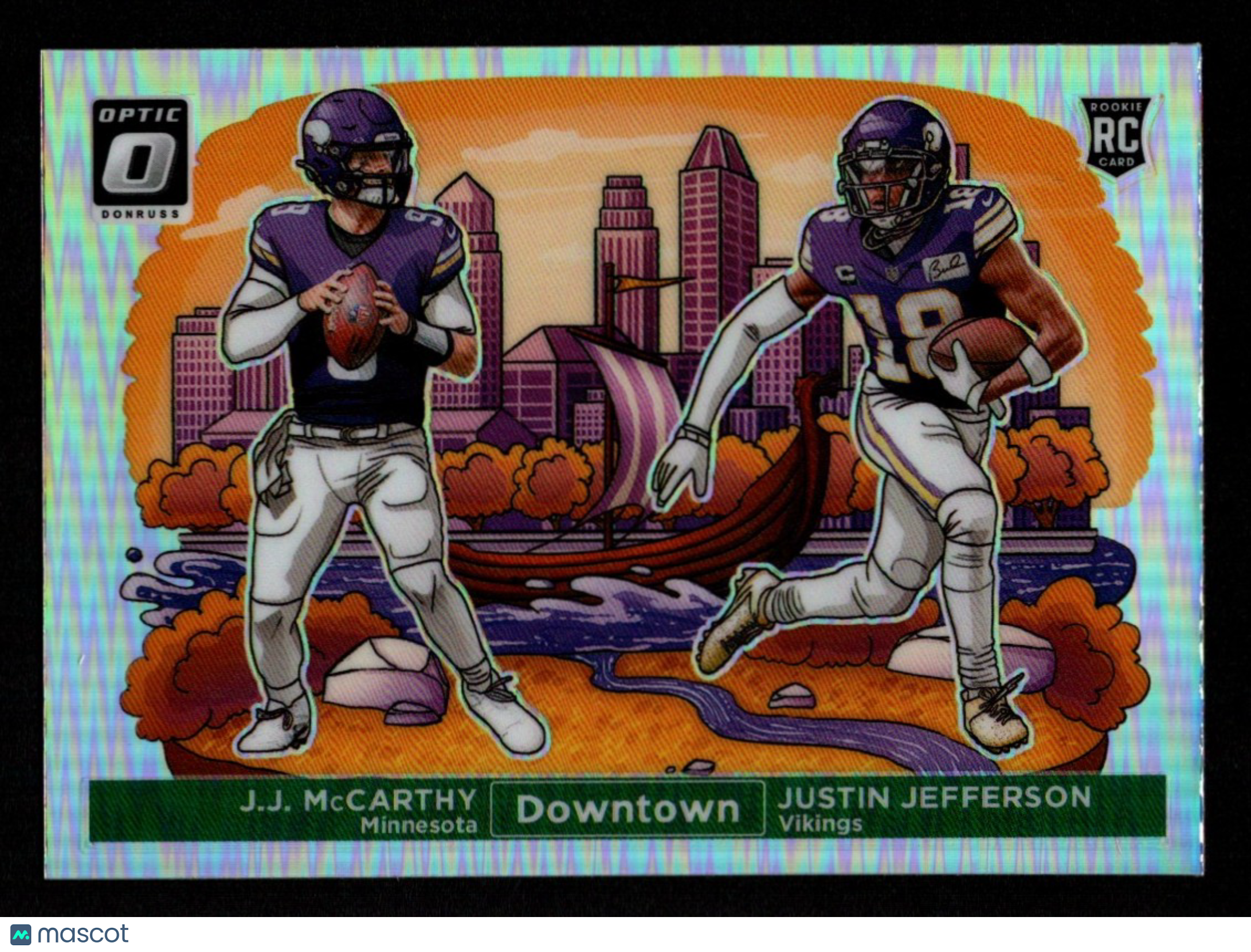 You are purchasing a Justin Jefferson/J.J. McCarthy 2024 Donruss Optic #DT-9 Dual Downtown SSP RC. You will receive the exact card shown in the photos. CONDITION GUARANTEE We provide detailed, high-resolution photos of every card. What you see is exactly what you'll receive. COMPETITIVE PRICING NOTICE Our cards are priced competitively based on current market data and recent sales. We regularly review and adjust our pricing to ensure fair market value for both buyers and collectors. PAYMENT POLICY ATX Cards requires all payments within FOUR (4) DAYS of purchase. Failure to make payment will result in cancellation of the order. SHIPPING All items are packaged with professional protective materials using USPS First Class or Priority. FREE COMBINED SHIPPING on multiple purchases. ABOUT US Based in the heart of Texas, we're passionate about bringing the sports card hobby to life as collectors serving collectors. Whether you're chasing vintage gems from the golden era or ultra-modern slabs fresh from the latest releases, every card in our inventory is hand-selected and thoroughly examined to ensure authenticity, quality, and fair pricing. Listed With Mascot.