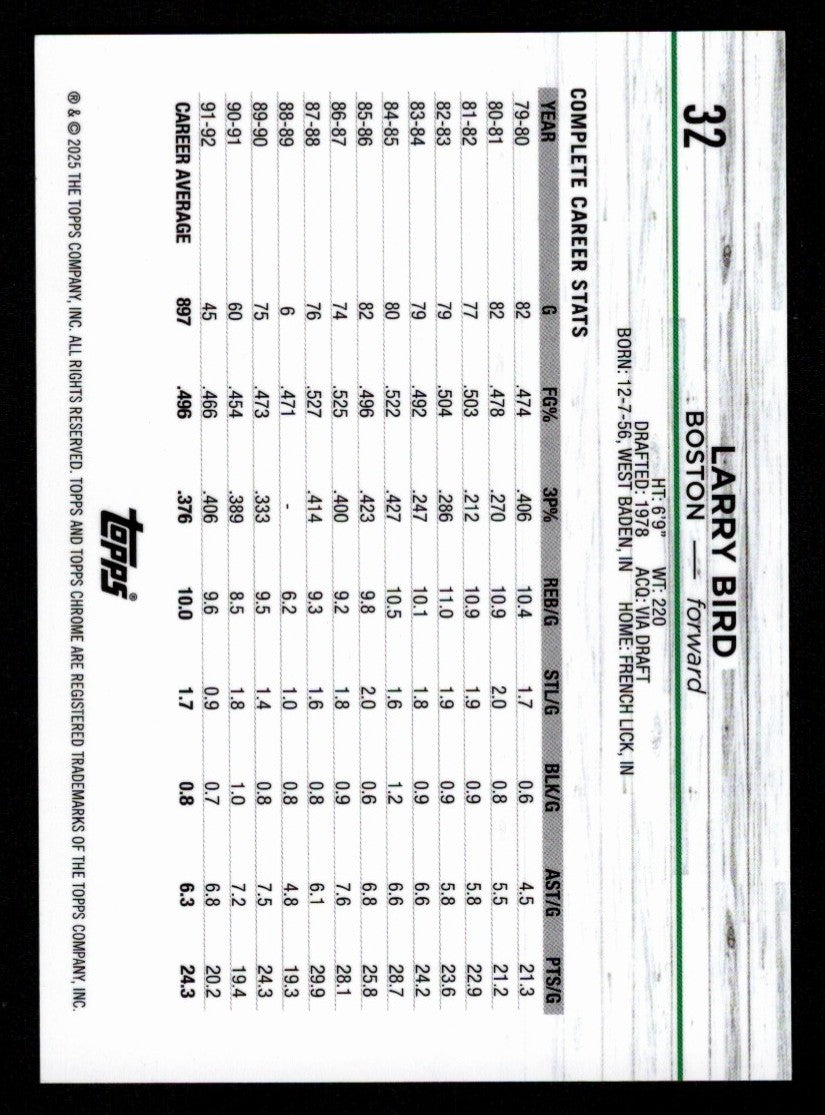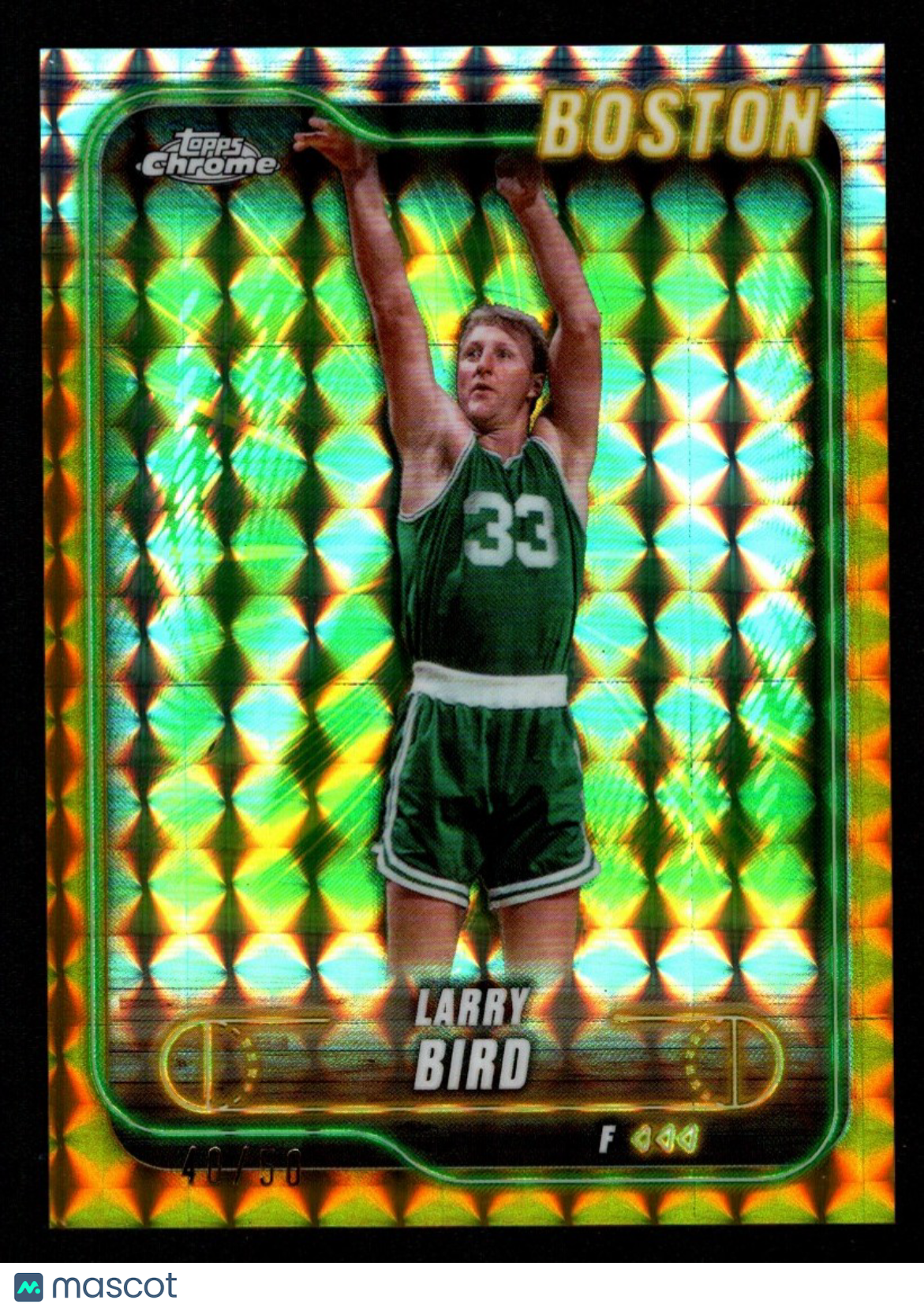 You are purchasing a Larry Bird 2024-25 Topps Chrome #F-44 Gold Geometric Refractor /50 Celtics. You will receive the exact card shown in the photos. CONDITION GUARANTEE We provide detailed, high-resolution photos of every card. What you see is exactly what you'll receive. COMPETITIVE PRICING NOTICE Our cards are priced competitively based on current market data and recent sales. We regularly review and adjust our pricing to ensure fair market value for both buyers and collectors. PAYMENT POLICY ATX Cards requires all payments within FOUR (4) DAYS of purchase. Failure to make payment will result in cancellation of the order. SHIPPING All items are packaged with professional protective materials using USPS First Class or Priority. FREE COMBINED SHIPPING on multiple purchases. ABOUT US Based in the heart of Texas, we're passionate about bringing the sports card hobby to life as collectors serving collectors. Whether you're chasing vintage gems from the golden era or ultra-modern slabs fresh from the latest releases, every card in our inventory is hand-selected and thoroughly examined to ensure authenticity, quality, and fair pricing. Listed With Mascot.