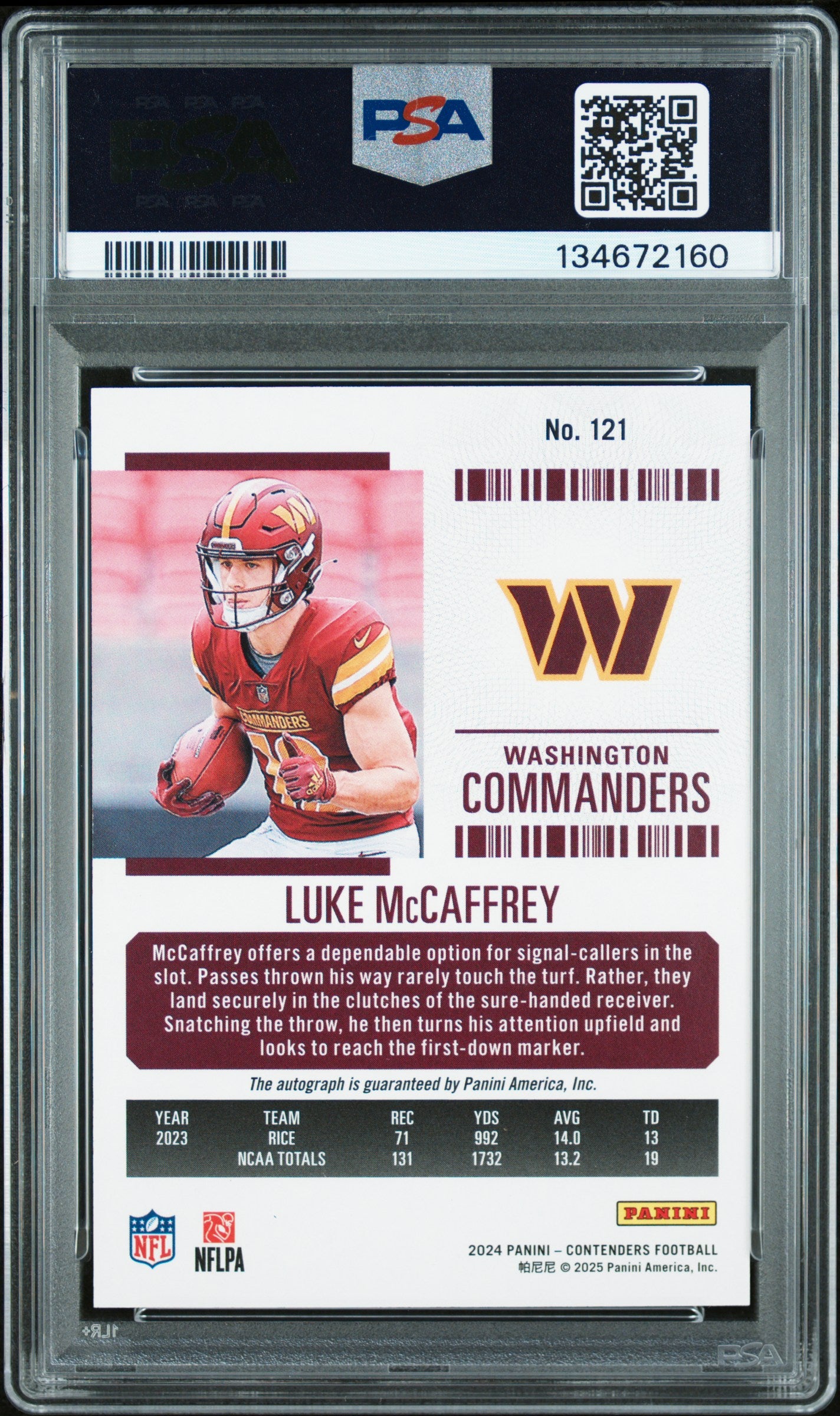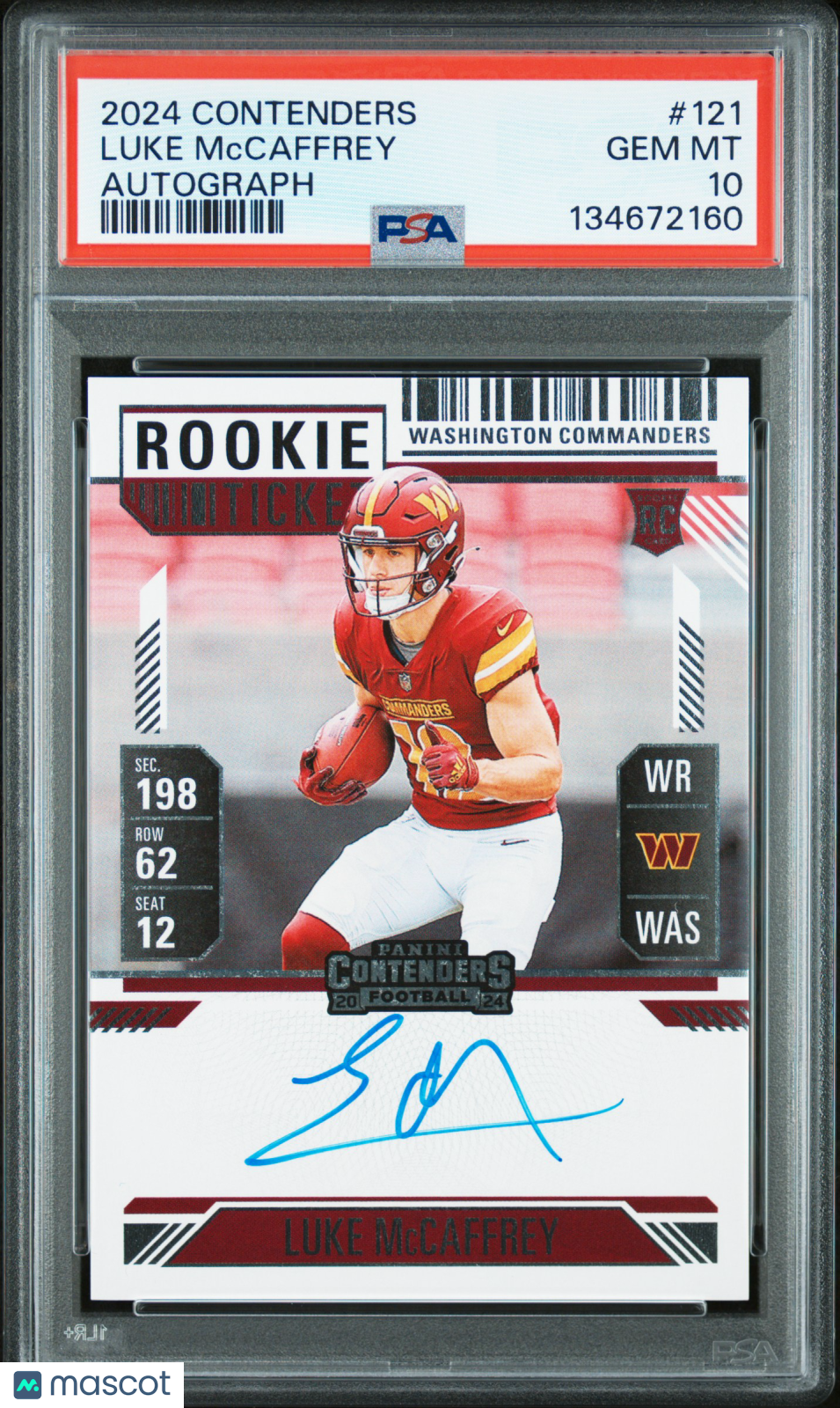 You are purchasing a Luke McCaffrey 2024 Panini Contenders #121 Rookie Ticket RC Auto PSA10 GEM MT. You will receive the exact card shown in the photos. CONDITION GUARANTEE We provide detailed, high-resolution photos of every card. What you see is exactly what you'll receive. COMPETITIVE PRICING NOTICE Our cards are priced competitively based on current market data and recent sales. We regularly review and adjust our pricing to ensure fair market value for both buyers and collectors. PAYMENT POLICY ATX Cards requires all payments within four (4) days of purchase. Failure to make payment will result in cancellation of the order. SHIPPING All items are packaged with professional protective materials using USPS First Class or Priority. FREE COMBINED SHIPPING on multiple purchases. ABOUT US ATX Cards & Collectibles is your trusted Austin, Texas source for sports cards and collectibles. You can find us on our website, eBay, COMC, MyCardPost, Instagram, WhatNot, and at card shows nationwide. Whether you're buying, selling, or trading, we're here to help you build your collection. Listed With Mascot.