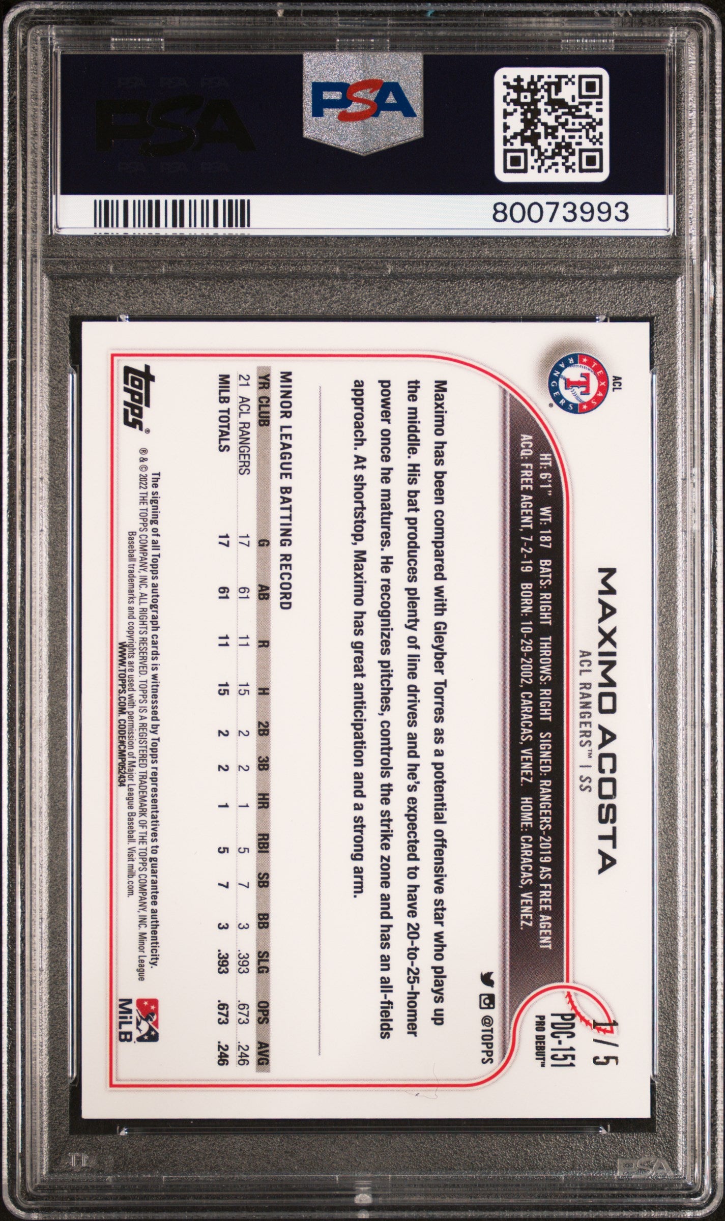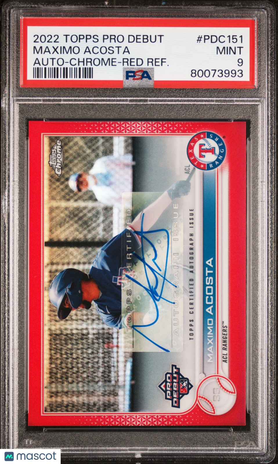 You are purchasing a Maximo Acosta 2022 Topps Pro Debut #151 Chrome Red Refractor /5 Auto PSA9 MINT. You will receive the exact card shown in the photos. CONDITION GUARANTEE We provide detailed, high-resolution photos of every card. What you see is exactly what you'll receive. COMPETITIVE PRICING NOTICE Our cards are priced competitively based on current market data and recent sales. We regularly review and adjust our pricing to ensure fair market value for both buyers and collectors. PAYMENT POLICY ATX Cards requires all payments within FOUR (4) DAYS of purchase. Failure to make payment will result in cancellation of the order. SHIPPING All items are packaged with professional protective materials using USPS First Class or Priority. FREE COMBINED SHIPPING on multiple purchases. ABOUT US Based in the heart of Texas, we're passionate about bringing the sports card hobby to life as collectors serving collectors. Whether you're chasing vintage gems from the golden era or ultra-modern slabs fresh from the latest releases, every card in our inventory is hand-selected and thoroughly examined to ensure authenticity, quality, and fair pricing. Listed With Mascot.