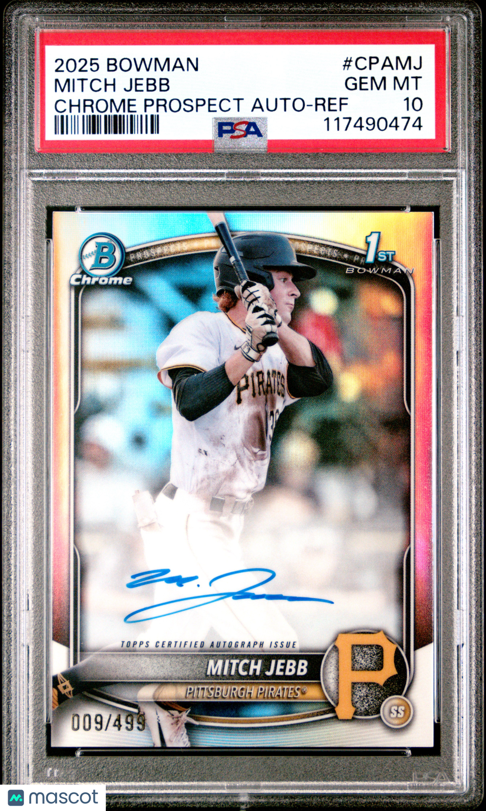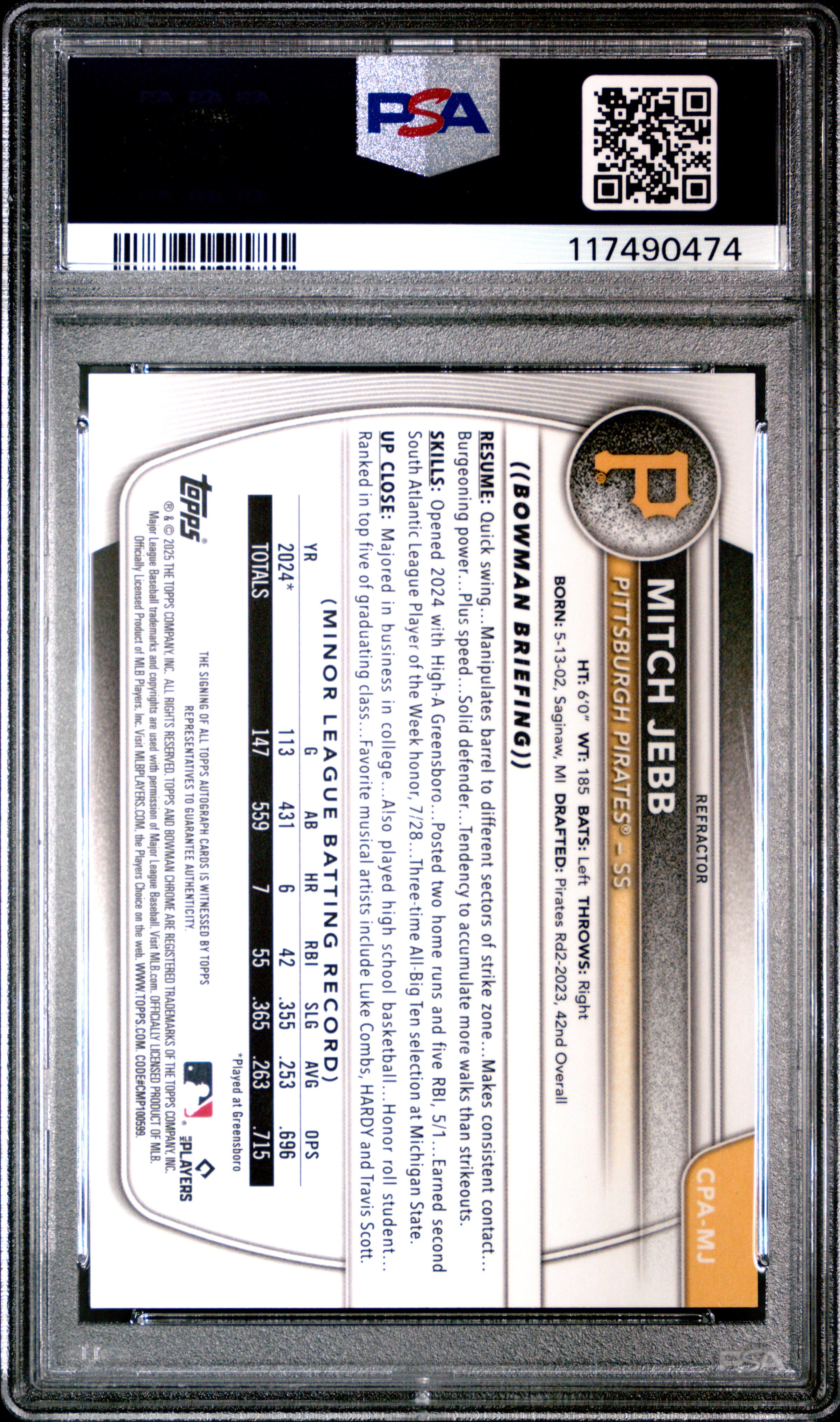 You are purchasing a Mitch Jebb 2025 Bowman Chrome #CPAMJ Refractor /499 Auto PSA10 GEM MT. You will receive the exact card shown in the photos. CONDITION GUARANTEE We provide detailed, high-resolution photos of every card. What you see is exactly what you'll receive. COMPETITIVE PRICING NOTICE Our cards are priced competitively based on current market data and recent sales. We regularly review and adjust our pricing to ensure fair market value for both buyers and collectors. PAYMENT POLICY ATX Cards requires all payments within four (4) days of purchase. Failure to make payment will result in cancellation of the order. SHIPPING All items are packaged with professional protective materials using USPS First Class or Priority. FREE COMBINED SHIPPING on multiple purchases. ABOUT US ATX Cards & Collectibles is your trusted Austin, Texas source for sports cards and collectibles. You can find us on our website, eBay, COMC, MyCardPost, Instagram, WhatNot, and at card shows nationwide. Whether you're buying, selling, or trading, we're here to help you build your collection. Listed With Mascot.