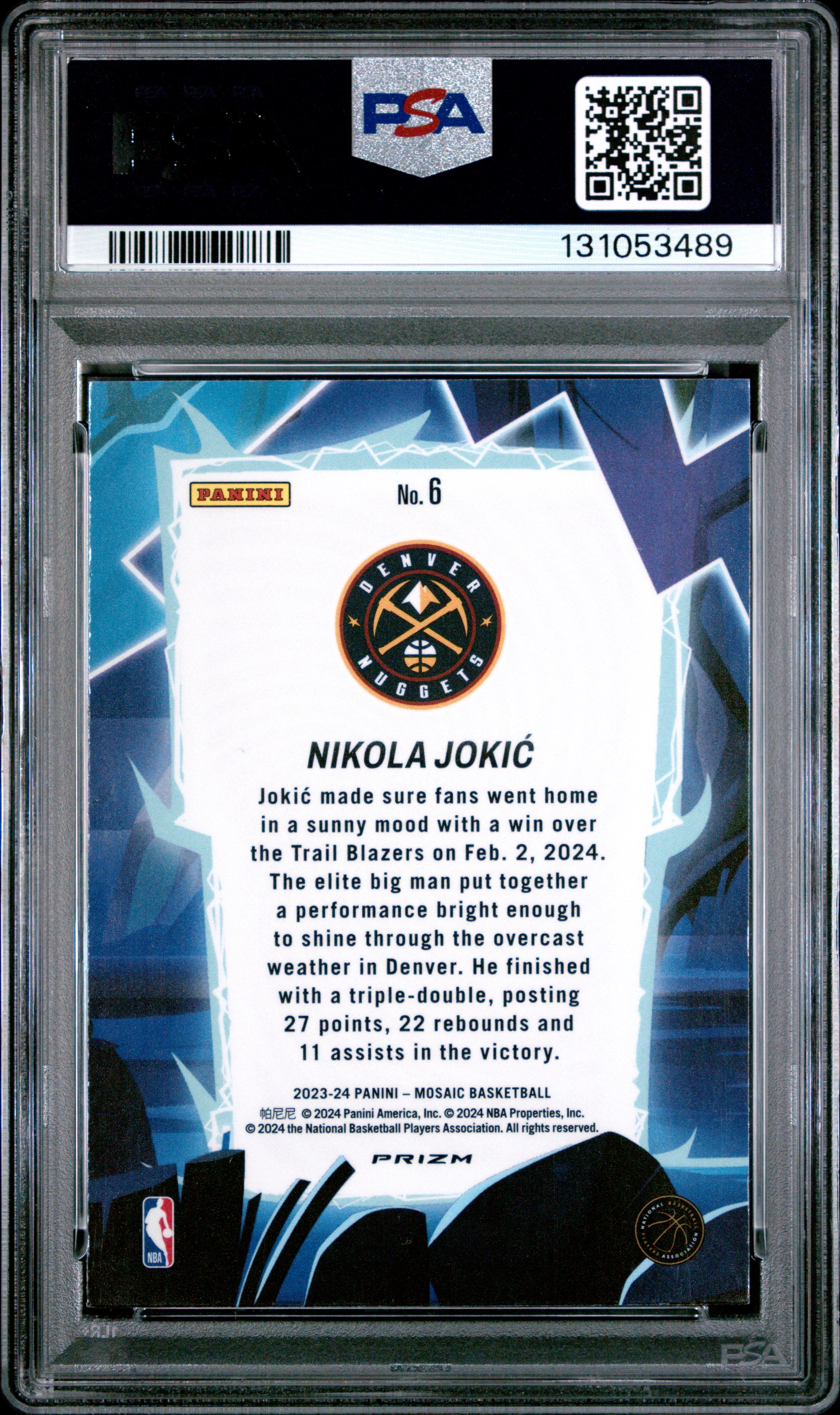 You are purchasing a Nikola Jokic 2023-24 Panini Mosaic #6 Storm Chasers SP PSA9 MINT. You will receive the exact card shown in the photos. CONDITION GUARANTEE We provide detailed, high-resolution photos of every card. What you see is exactly what you'll receive. COMPETITIVE PRICING NOTICE Our cards are priced competitively based on current market data and recent sales. We regularly review and adjust our pricing to ensure fair market value for both buyers and collectors. PAYMENT POLICY ATX Cards requires all payments within four (4) days of purchase. Failure to make payment will result in cancellation of the order. SHIPPING All items are packaged with professional protective materials using USPS First Class or Priority. FREE COMBINED SHIPPING on multiple purchases. ABOUT US ATX Cards & Collectibles is your trusted Austin, Texas source for sports cards and collectibles. You can find us on our website, eBay, COMC, MyCardPost, Instagram, WhatNot, and at card shows nationwide. Whether you're buying, selling, or trading, we're here to help you build your collection. Listed With Mascot.