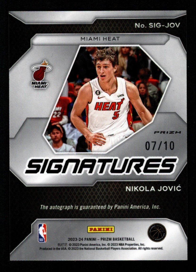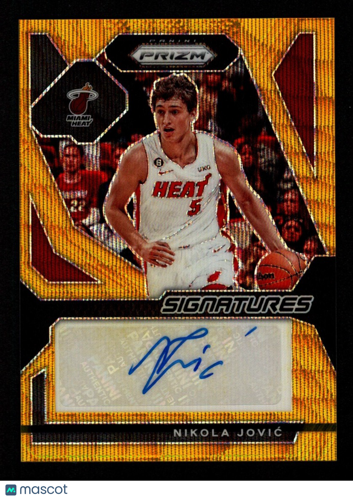 You are purchasing a Nikola Jović 2023-24 Panini Prizm #SIG-JOV Signatures Gold Wave /10 Auto Miami Heat. You will receive the exact card shown in the photos. CONDITION GUARANTEE We provide detailed, high-resolution photos of every card. What you see is exactly what you'll receive. COMPETITIVE PRICING NOTICE Our cards are priced competitively based on current market data and recent sales. We regularly review and adjust our pricing to ensure fair market value for both buyers and collectors. PAYMENT POLICY ATX Cards requires all payments within four (4) days of purchase. Failure to make payment will result in cancellation of the order. SHIPPING All items are packaged with professional protective materials using USPS First Class or Priority. FREE COMBINED SHIPPING on multiple purchases. ABOUT US ATX Cards & Collectibles is your trusted Austin, Texas source for sports cards and collectibles. You can find us on our website, eBay, COMC, MyCardPost, Instagram, WhatNot, and at card shows nationwide. Whether you're buying, selling, or trading, we're here to help you build your collection. Listed With Mascot.