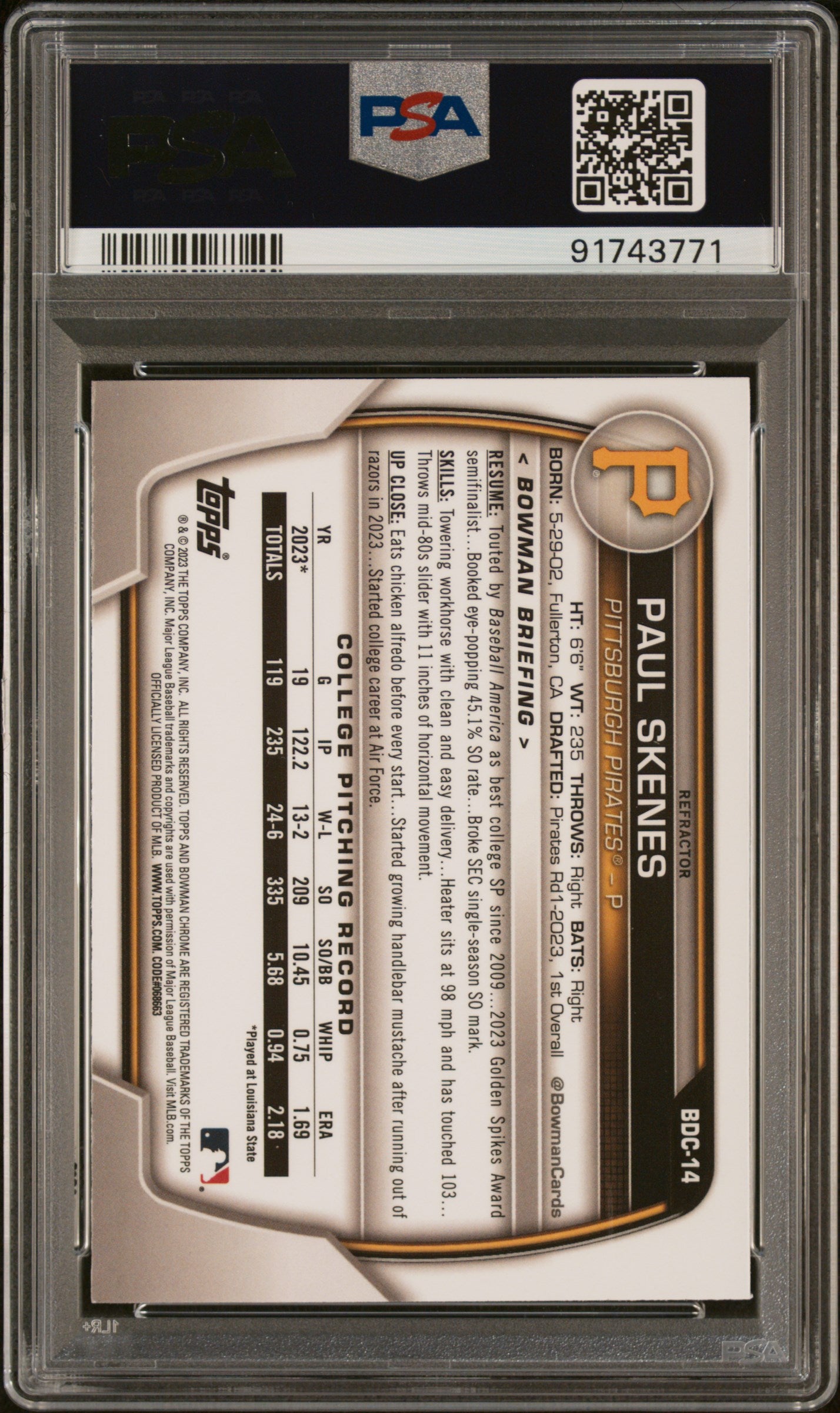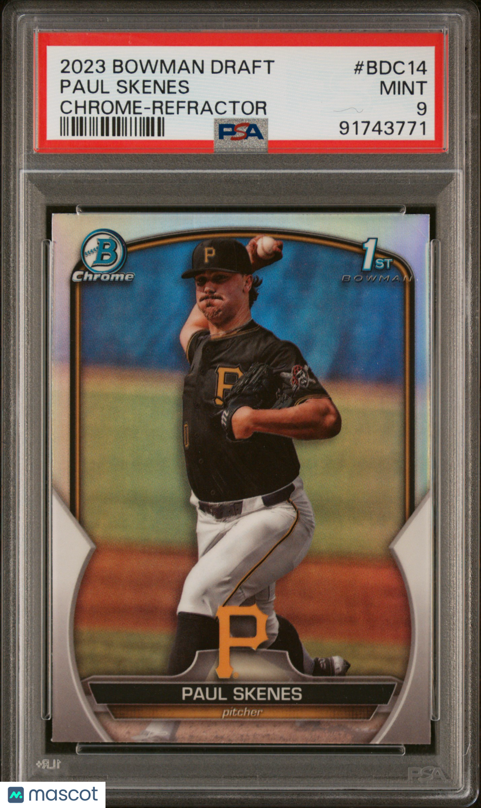You are purchasing a Paul Skenes 2023 Bowman Draft #BDC14 Chrome Refractor RC PSA9 MINT Pirates. You will receive the exact card shown in the photos. CONDITION GUARANTEE We provide detailed, high-resolution photos of every card. What you see is exactly what you'll receive. COMPETITIVE PRICING NOTICE Our cards are priced competitively based on current market data and recent sales. We regularly review and adjust our pricing to ensure fair market value for both buyers and collectors. PAYMENT POLICY ATX Cards requires all payments within FOUR (4) DAYS of purchase. Failure to make payment will result in cancellation of the order. SHIPPING All items are packaged with professional protective materials using USPS First Class or Priority. FREE COMBINED SHIPPING on multiple purchases. ABOUT US Based in the heart of Texas, we're passionate about bringing the sports card hobby to life as collectors serving collectors. Whether you're chasing vintage gems from the golden era or ultra-modern slabs fresh from the latest releases, every card in our inventory is hand-selected and thoroughly examined to ensure authenticity, quality, and fair pricing. Listed With Mascot.