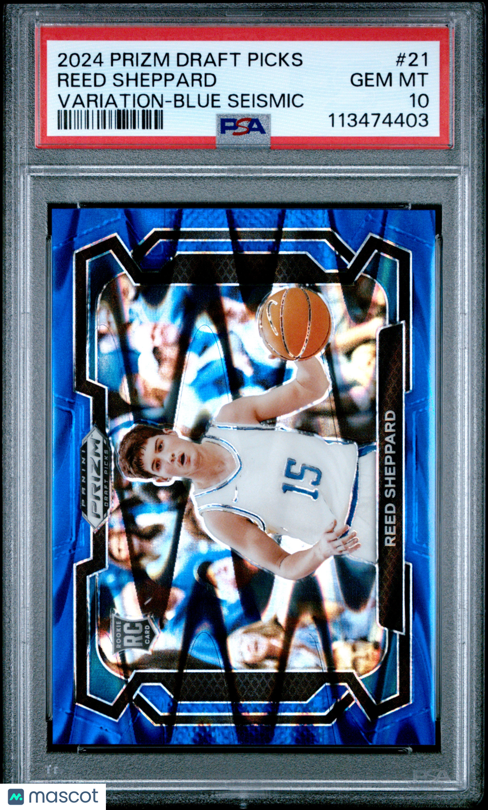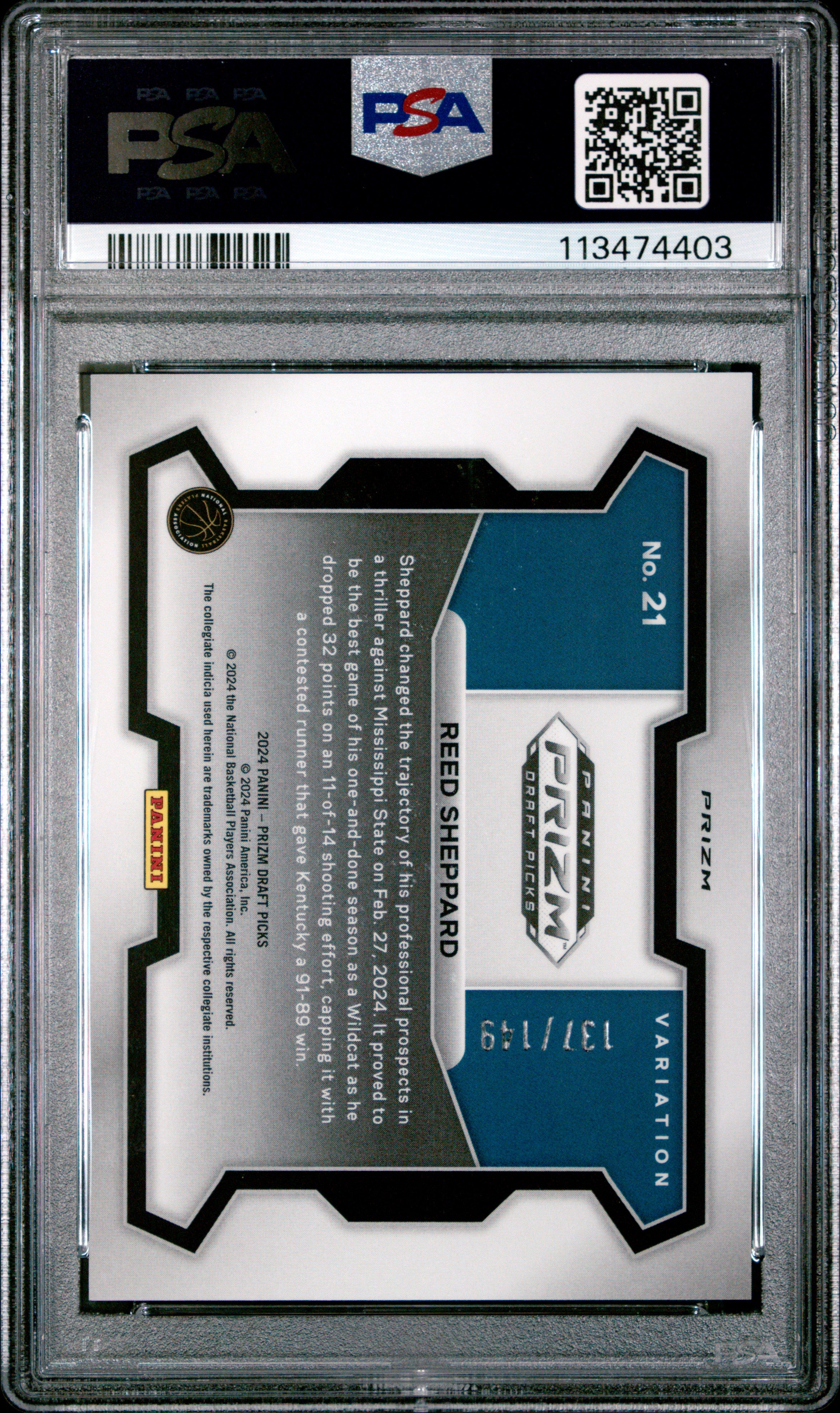 You are purchasing a Reed Sheppard 2024 Prizm Draft #21 Variation Blue Seismic /149 RC PSA10 GEM MT. You will receive the exact card shown in the photos. CONDITION GUARANTEE We provide detailed, high-resolution photos of every card. What you see is exactly what you'll receive. COMPETITIVE PRICING NOTICE Our cards are priced competitively based on current market data and recent sales. We regularly review and adjust our pricing to ensure fair market value for both buyers and collectors. PAYMENT POLICY ATX Cards requires all payments within FOUR (4) DAYS of purchase. Failure to make payment will result in cancellation of the order. SHIPPING All items are packaged with professional protective materials using USPS First Class or Priority. FREE COMBINED SHIPPING on multiple purchases. ABOUT US Based in the heart of Texas, we're passionate about bringing the sports card hobby to life as collectors serving collectors. Whether you're chasing vintage gems from the golden era or ultra-modern slabs fresh from the latest releases, every card in our inventory is hand-selected and thoroughly examined to ensure authenticity, quality, and fair pricing. Listed With Mascot.