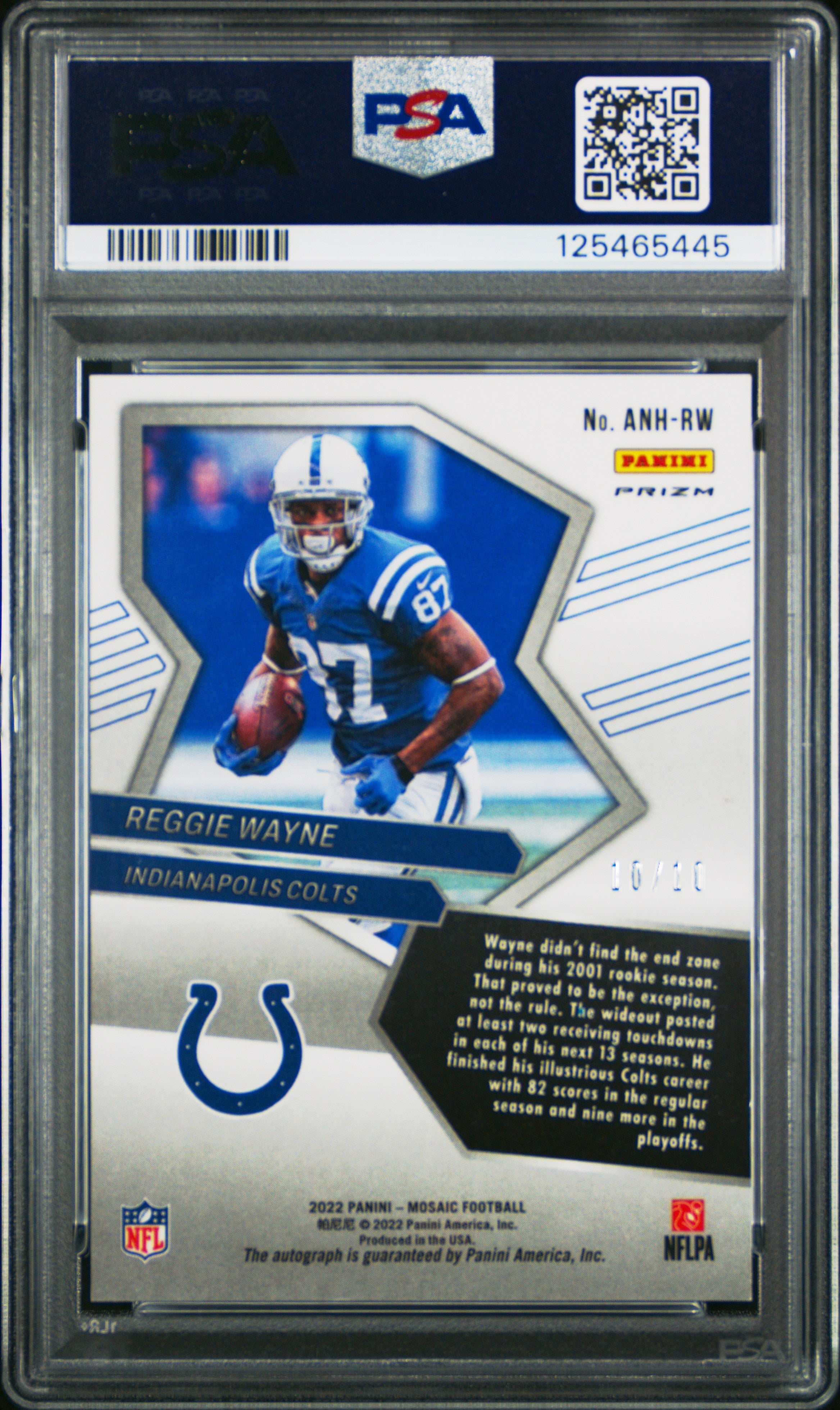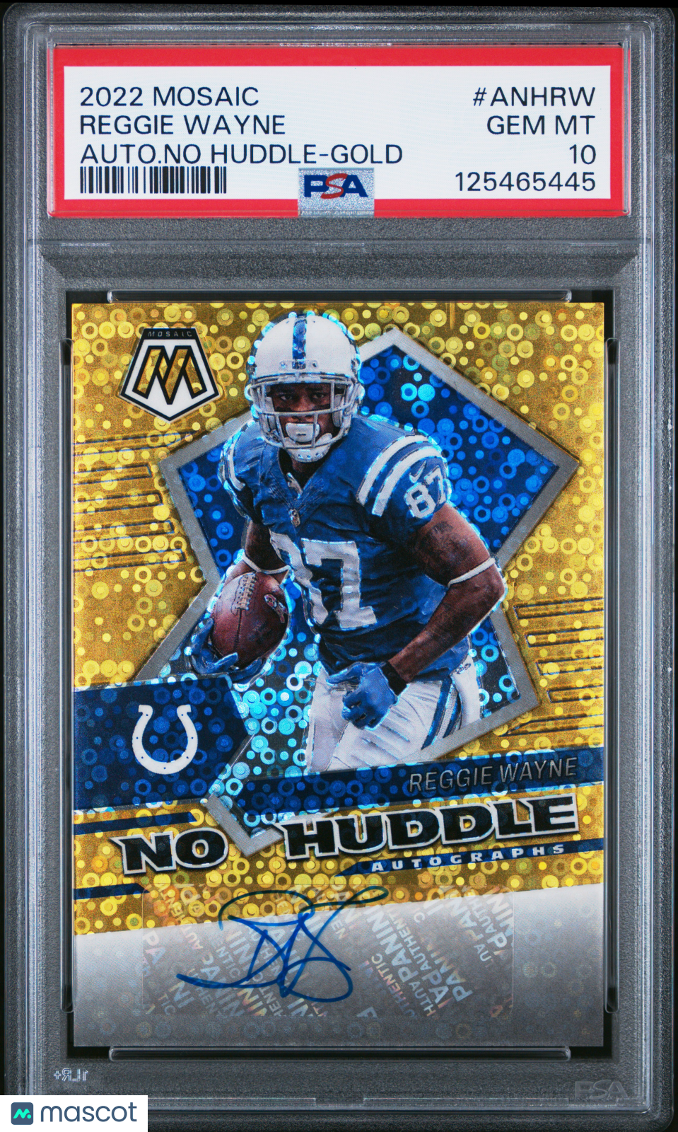 You are purchasing a Reggie Wayne 2022 Panini Mosaic #ANHRW No Huddle Gold /10 Auto PSA10 GEM MT. You will receive the exact card shown in the photos. CONDITION GUARANTEE We provide detailed, high-resolution photos of every card. What you see is exactly what you'll receive. COMPETITIVE PRICING NOTICE Our cards are priced competitively based on current market data and recent sales. We regularly review and adjust our pricing to ensure fair market value for both buyers and collectors. PAYMENT POLICY ATX Cards requires all payments within FOUR (4) DAYS of purchase. Failure to make payment will result in cancellation of the order. SHIPPING All items are packaged with professional protective materials using USPS First Class or Priority. FREE COMBINED SHIPPING on multiple purchases. ABOUT US Based in the heart of Texas, we're passionate about bringing the sports card hobby to life as collectors serving collectors. Whether you're chasing vintage gems from the golden era or ultra-modern slabs fresh from the latest releases, every card in our inventory is hand-selected and thoroughly examined to ensure authenticity, quality, and fair pricing. Listed With Mascot.