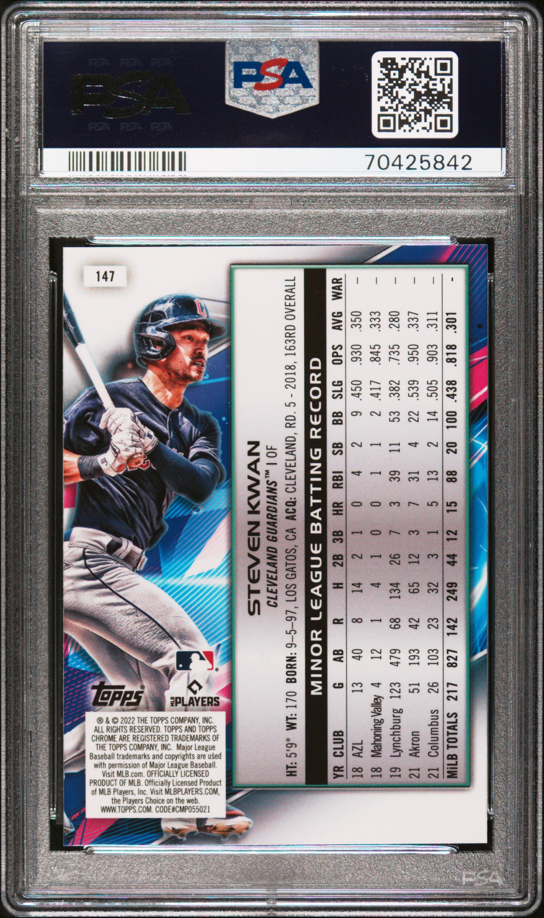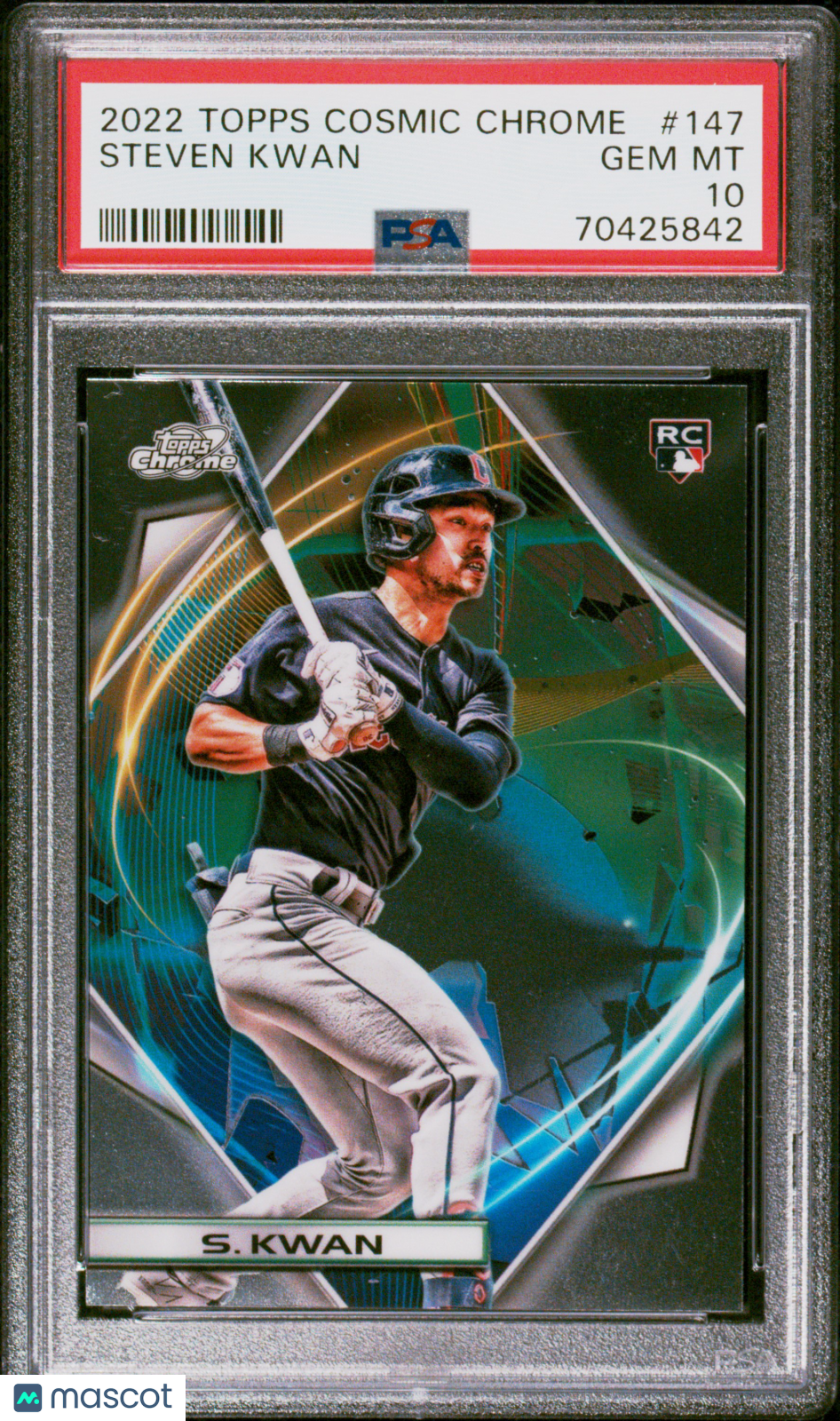 You are purchasing a Steven Kwan 2022 Topps Cosmic Chrome #147 Rookie RC PSA10 GEM MT. You will receive the exact card shown in the photos. CONDITION GUARANTEE We provide detailed, high-resolution photos of every card. What you see is exactly what you'll receive. COMPETITIVE PRICING NOTICE Our cards are priced competitively based on current market data and recent sales. We regularly review and adjust our pricing to ensure fair market value for both buyers and collectors. PAYMENT POLICY ATX Cards requires all payments within four (4) days of purchase. Failure to make payment will result in cancellation of the order. SHIPPING All items are packaged with professional protective materials using USPS First Class or Priority. FREE COMBINED SHIPPING on multiple purchases. ABOUT US ATX Cards and Collectibles is your trusted Austin, Texas source for sports cards and collectibles. You can find us on our website, eBay, COMC, MyCardPost, Instagram, WhatNot, and at card shows nationwide. Whether you're buying, selling, or trading, we're here to help you build your collection. Listed With Mascot.