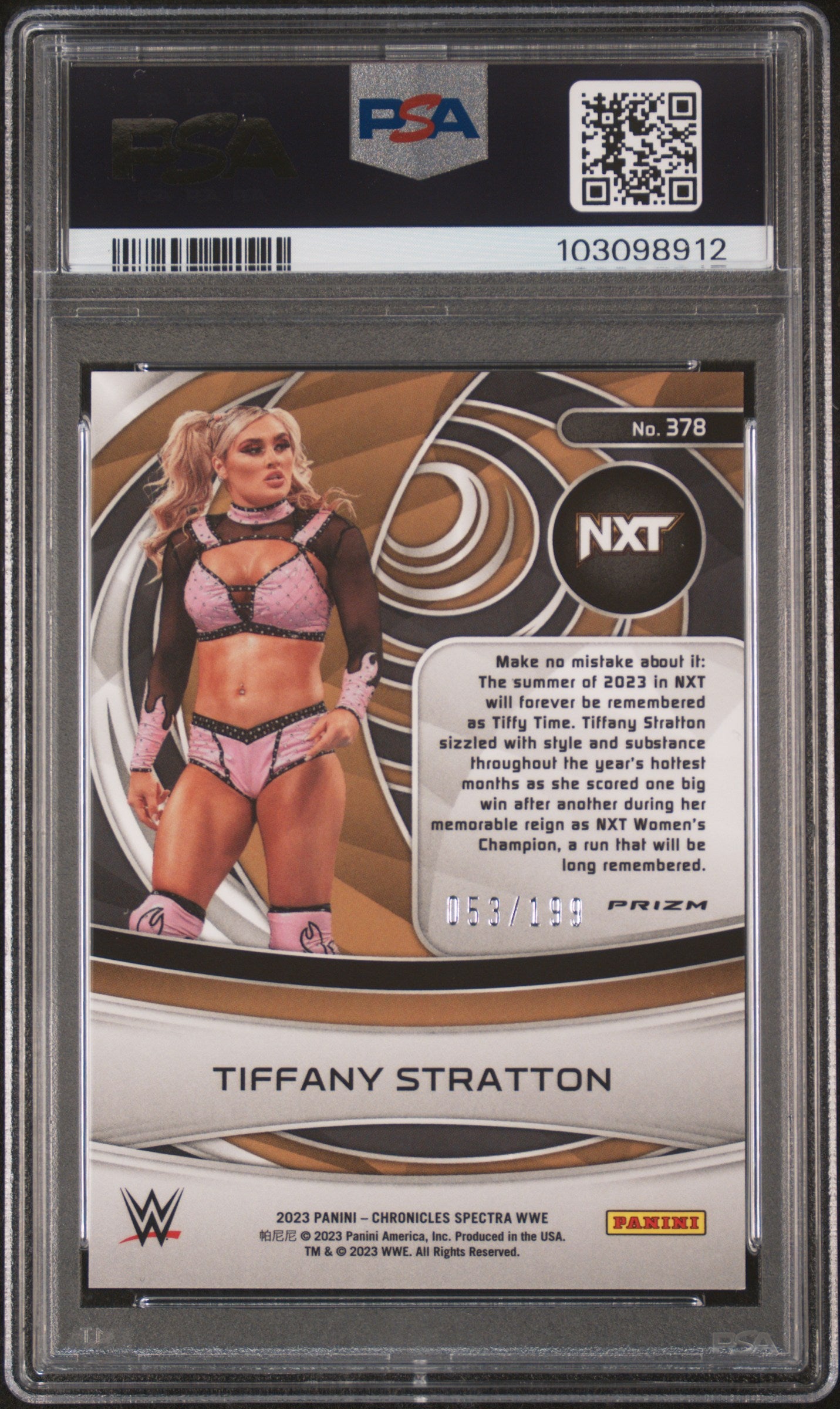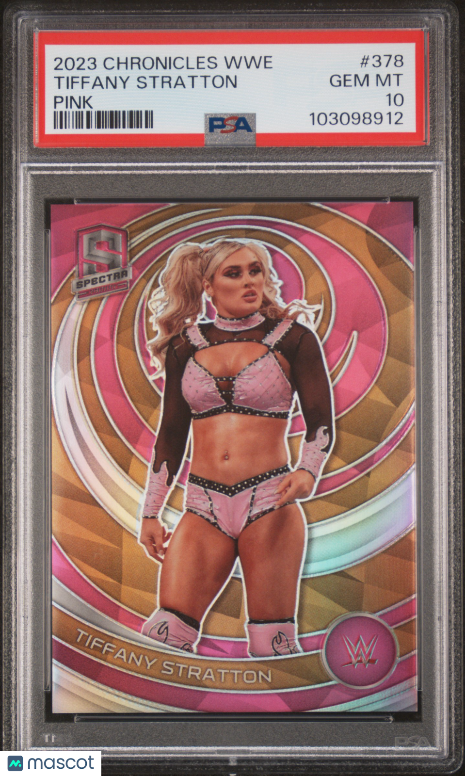 You are purchasing a Tiffany Stratton 2023 Panini Chronicles WWE #378 Spectra Pink /199 PSA10 GEM MT. You will receive the exact card shown in the photos. CONDITION GUARANTEE We provide detailed, high-resolution photos of every card. What you see is exactly what you'll receive. COMPETITIVE PRICING NOTICE Our cards are priced competitively based on current market data and recent sales. We regularly review and adjust our pricing to ensure fair market value for both buyers and collectors. PAYMENT POLICY ATX Cards requires all payments within FOUR (4) DAYS of purchase. Failure to make payment will result in cancellation of the order. SHIPPING All items are packaged with professional protective materials using USPS First Class or Priority. FREE COMBINED SHIPPING on multiple purchases. ABOUT US Based in the heart of Texas, we're passionate about bringing the sports card hobby to life as collectors serving collectors. Whether you're chasing vintage gems from the golden era or ultra-modern slabs fresh from the latest releases, every card in our inventory is hand-selected and thoroughly examined to ensure authenticity, quality, and fair pricing. Listed With Mascot.