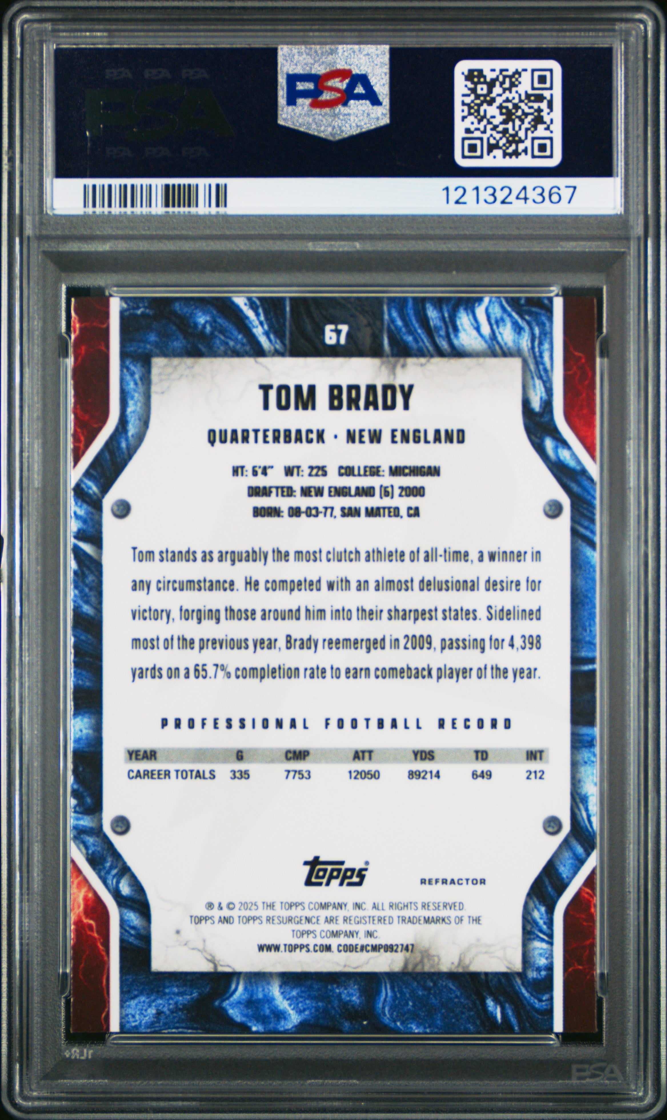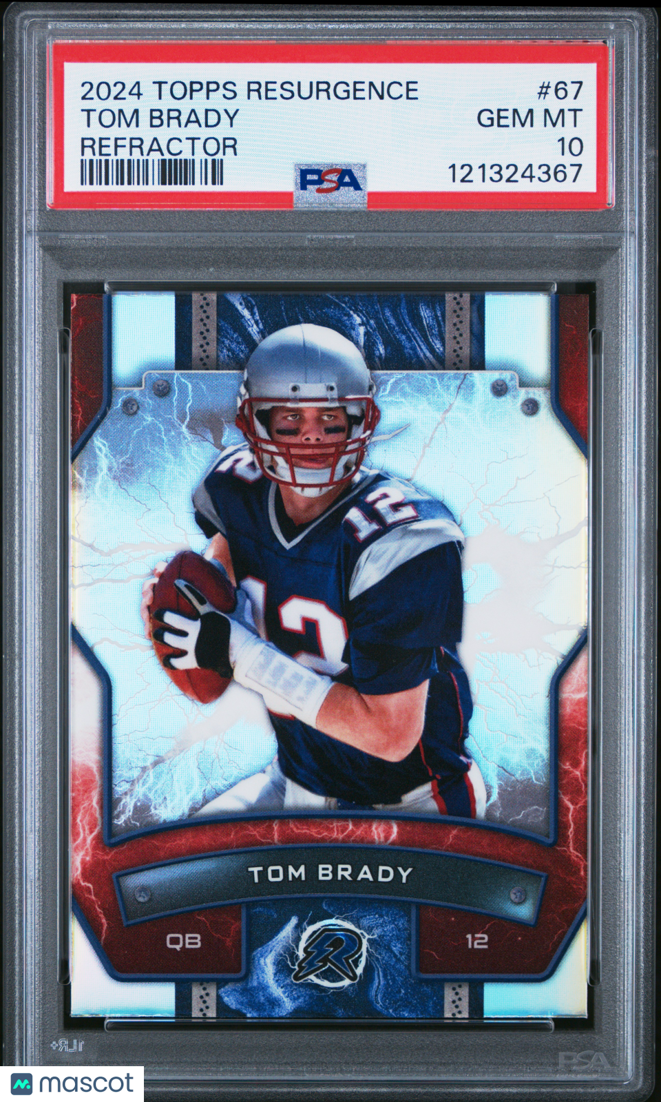 You are purchasing a Tom Brady 2024 Topps Resurgence #67 Refractor PSA10 GEM MT. You will receive the exact card shown in the photos. CONDITION GUARANTEE We provide detailed, high-resolution photos of every card. What you see is exactly what you'll receive. COMPETITIVE PRICING NOTICE Our cards are priced competitively based on current market data and recent sales. We regularly review and adjust our pricing to ensure fair market value for both buyers and collectors. PAYMENT POLICY ATX Cards requires all payments within FOUR (4) DAYS of purchase. Failure to make payment will result in cancellation of the order. SHIPPING All items are packaged with professional protective materials using USPS First Class or Priority. FREE COMBINED SHIPPING on multiple purchases. ABOUT US Based in the heart of Texas, we're passionate about bringing the sports card hobby to life as collectors serving collectors. Whether you're chasing vintage gems from the golden era or ultra-modern slabs fresh from the latest releases, every card in our inventory is hand-selected and thoroughly examined to ensure authenticity, quality, and fair pricing. Listed With Mascot.