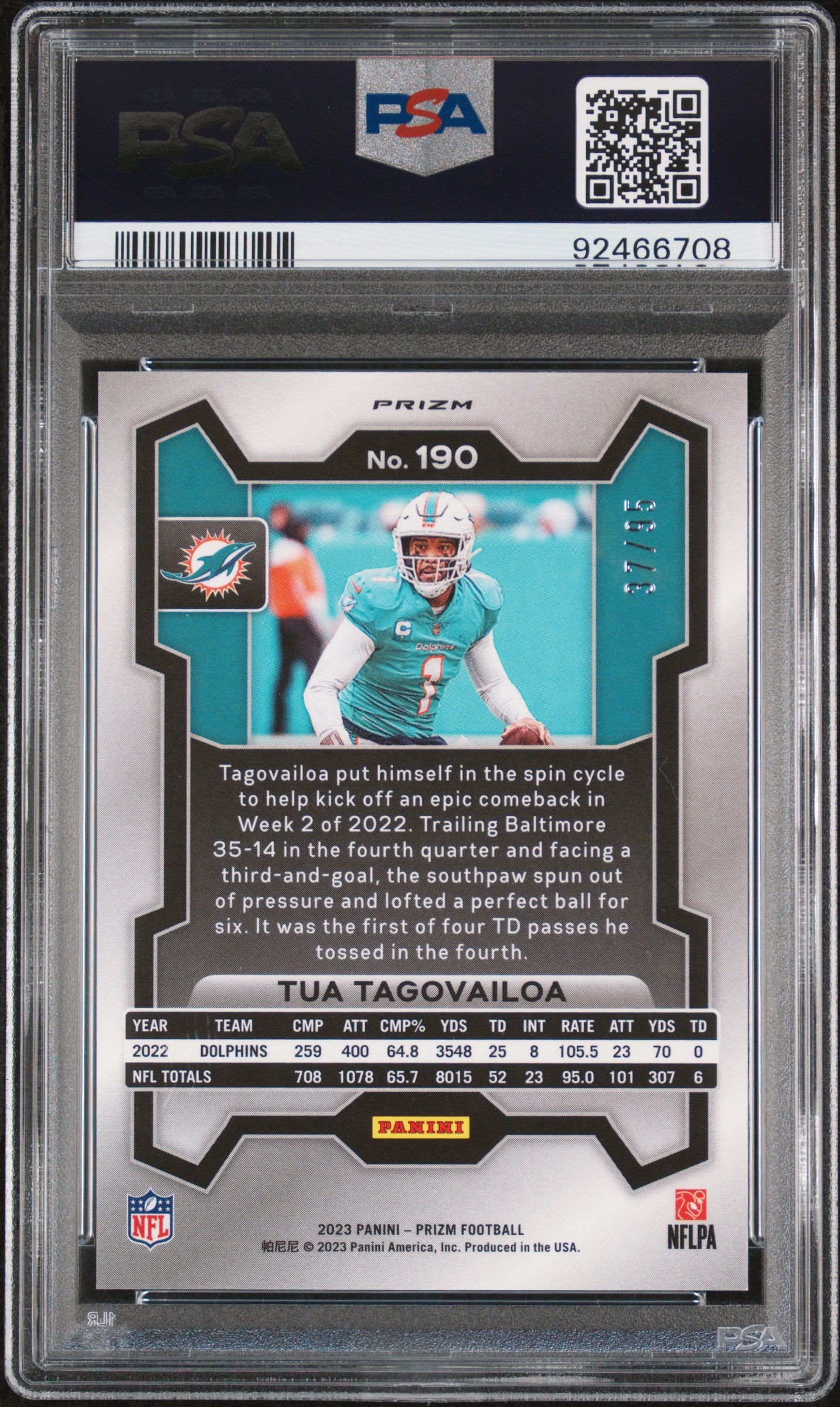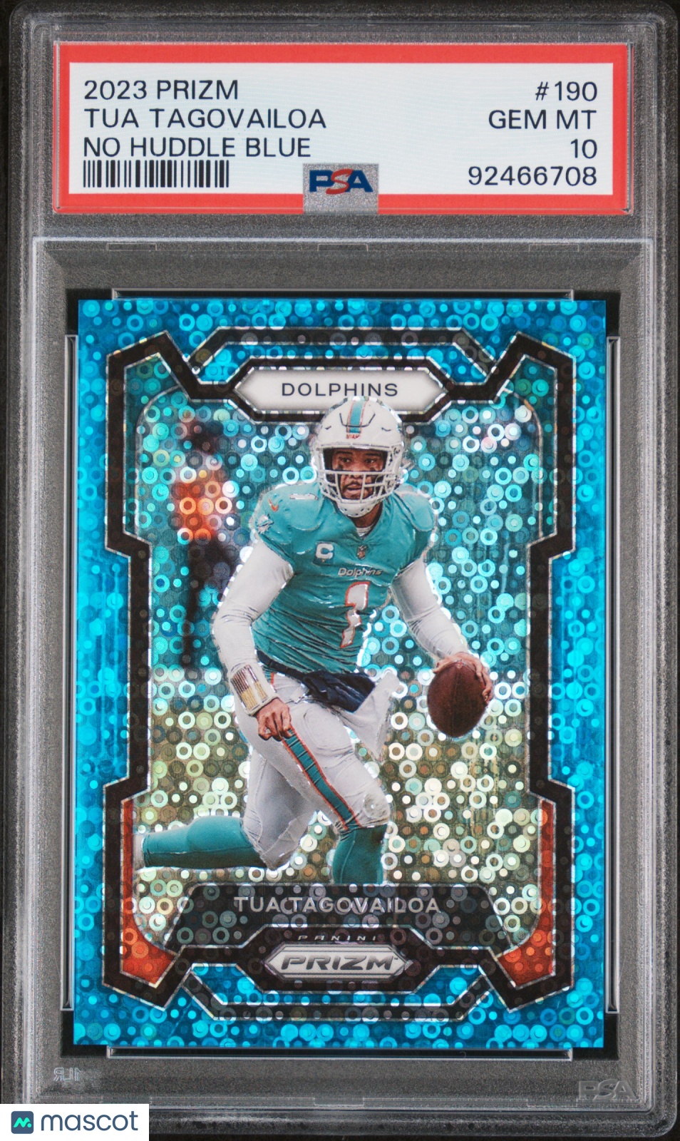 You are purchasing a Tua Tagovailoa 2023 Panini Prizm #190 No Huddle Blue /95 PSA10 GEM MT Dolphins. You will receive the exact card shown in the photos. CONDITION GUARANTEE We provide detailed, high-resolution photos of every card. What you see is exactly what you'll receive. COMPETITIVE PRICING NOTICE Our cards are priced competitively based on current market data and recent sales. We regularly review and adjust our pricing to ensure fair market value for both buyers and collectors. PAYMENT POLICY ATX Cards requires all payments within FOUR (4) DAYS of purchase. Failure to make payment will result in cancellation of the order. SHIPPING All items are packaged with professional protective materials using USPS First Class or Priority. FREE COMBINED SHIPPING on multiple purchases. ABOUT US Based in the heart of Texas, we're passionate about bringing the sports card hobby to life as collectors serving collectors. Whether you're chasing vintage gems from the golden era or ultra-modern slabs fresh from the latest releases, every card in our inventory is hand-selected and thoroughly examined to ensure authenticity, quality, and fair pricing. Listed With Mascot.