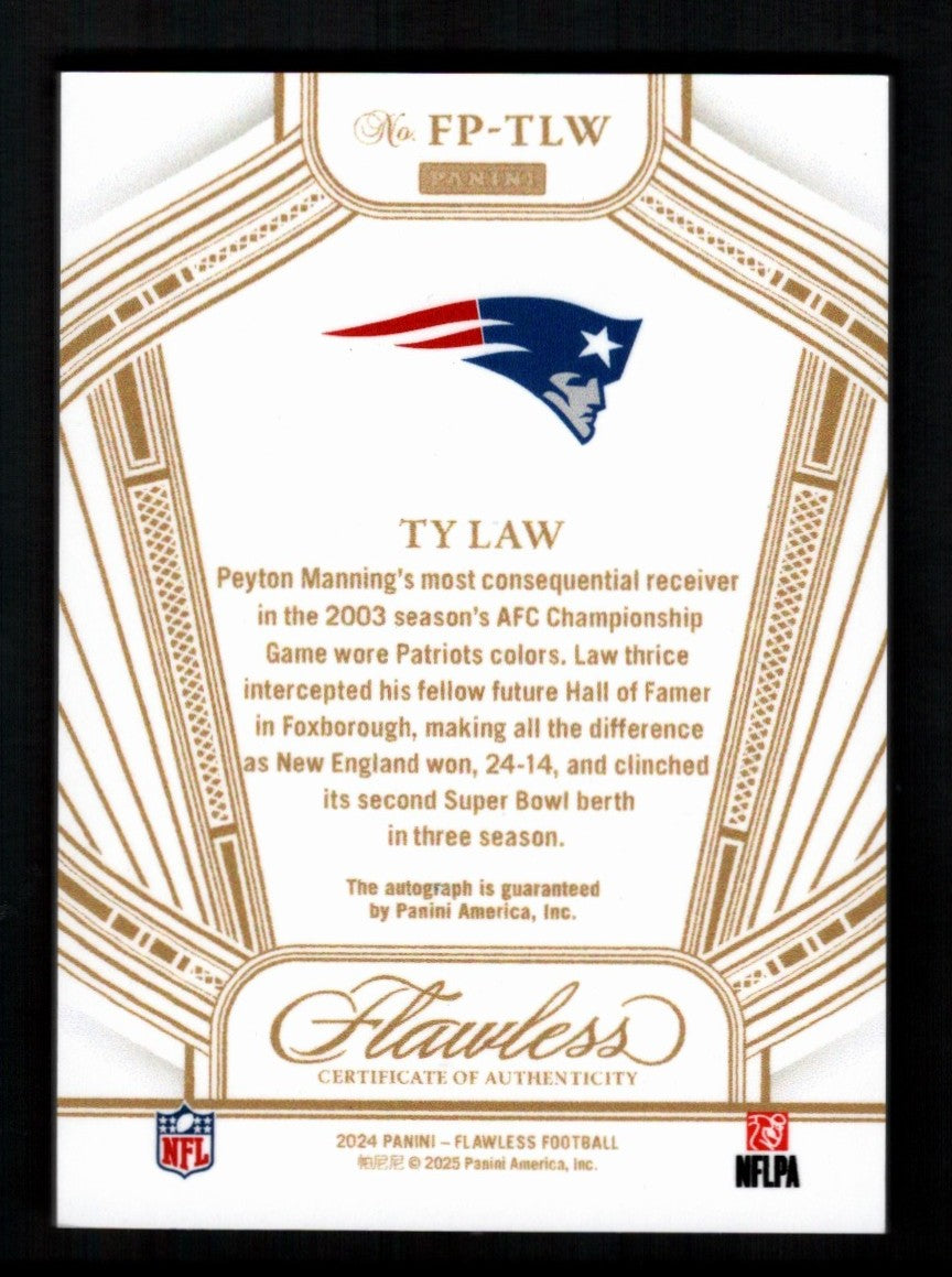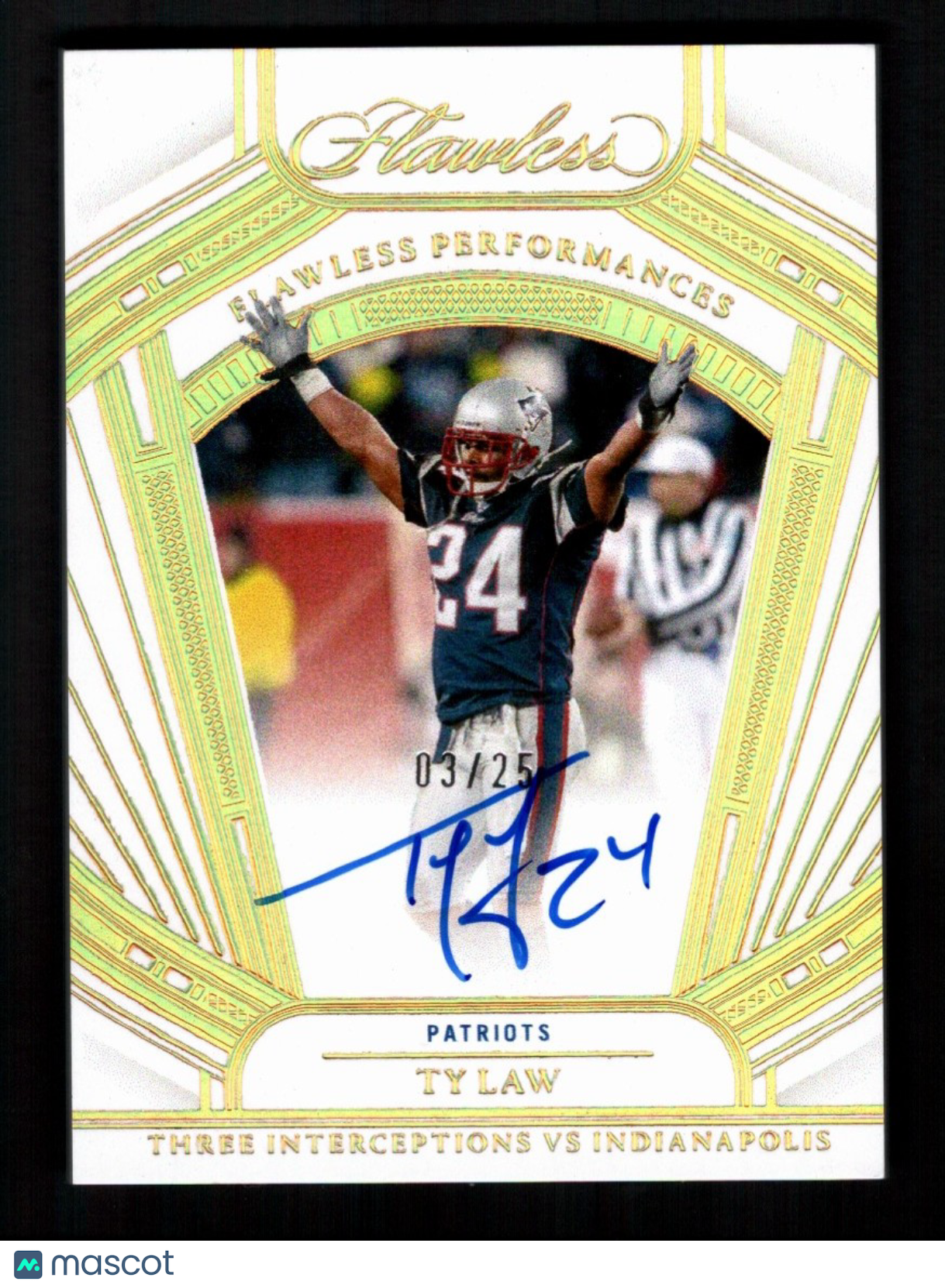 You are purchasing a Ty Law 2024 Panini Flawless #FP-TLW Flawless Performances /25 Auto. You will receive the exact card shown in the photos. CONDITION GUARANTEE We provide detailed, high-resolution photos of every card. What you see is exactly what you'll receive. COMPETITIVE PRICING NOTICE Our cards are priced competitively based on current market data and recent sales. We regularly review and adjust our pricing to ensure fair market value for both buyers and collectors. PAYMENT POLICY ATX Cards requires all payments within four (4) days of purchase. Failure to make payment will result in cancellation of the order. SHIPPING All items are packaged with professional protective materials using USPS First Class or Priority. FREE COMBINED SHIPPING on multiple purchases. ABOUT US ATX Cards and Collectibles is your trusted Austin, Texas source for sports cards and collectibles. You can find us on our website, eBay, COMC, MyCardPost, Instagram, WhatNot, and at card shows nationwide. Whether you're buying, selling, or trading, we're here to help you build your collection. Listed With Mascot.