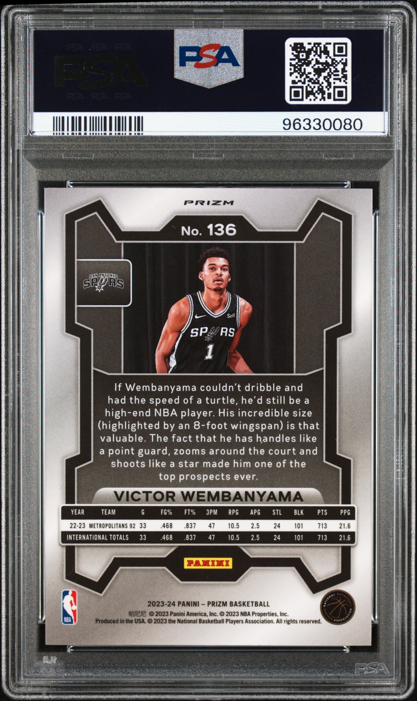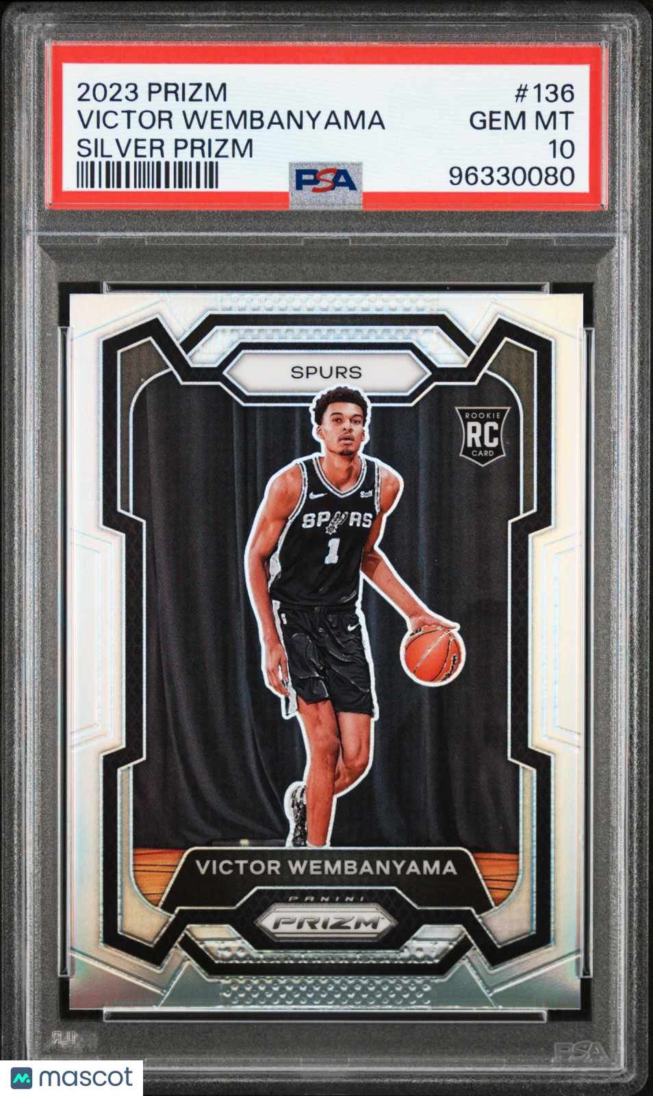 You are purchasing a Victor Wembanyama 2023-24 Panini Prizm #136 Silver Prizm PSA10 GEM MT. You will receive the exact card shown in the photos. CONDITION GUARANTEE We provide detailed, high-resolution photos of every card. What you see is exactly what you'll receive. COMPETITIVE PRICING NOTICE Our cards are priced competitively based on current market data and recent sales. We regularly review and adjust our pricing to ensure fair market value for both buyers and collectors. PAYMENT POLICY ATX Cards requires all payments within four (4) days of purchase. Failure to make payment will result in cancellation of the order. SHIPPING All items are packaged with professional protective materials using USPS First Class or Priority. FREE COMBINED SHIPPING on multiple purchases. ABOUT US ATX Cards and Collectibles is your trusted Austin, Texas source for sports cards and collectibles. You can find us on our website, eBay, COMC, MyCardPost, Instagram, WhatNot, and at card shows nationwide. Whether you're buying, selling, or trading, we're here to help you build your collection. Listed With Mascot.